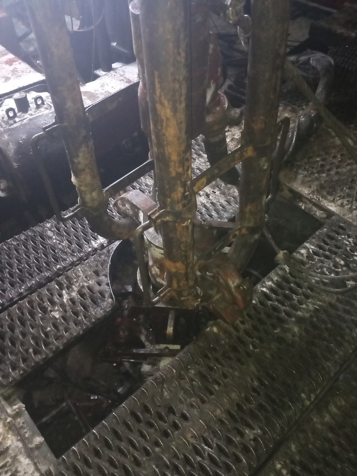 Скручивает трубу (опять же не сделав несколько оборотов вручную), потом затягивает ее с помощью гидравлического ключа. Бурильщик открывает спайдер, отпускает тормоз лебедки (палку), и под собственным весом трубы спускаются вниз. Под конец видео видно, как в трубу кидают проходной шаблон