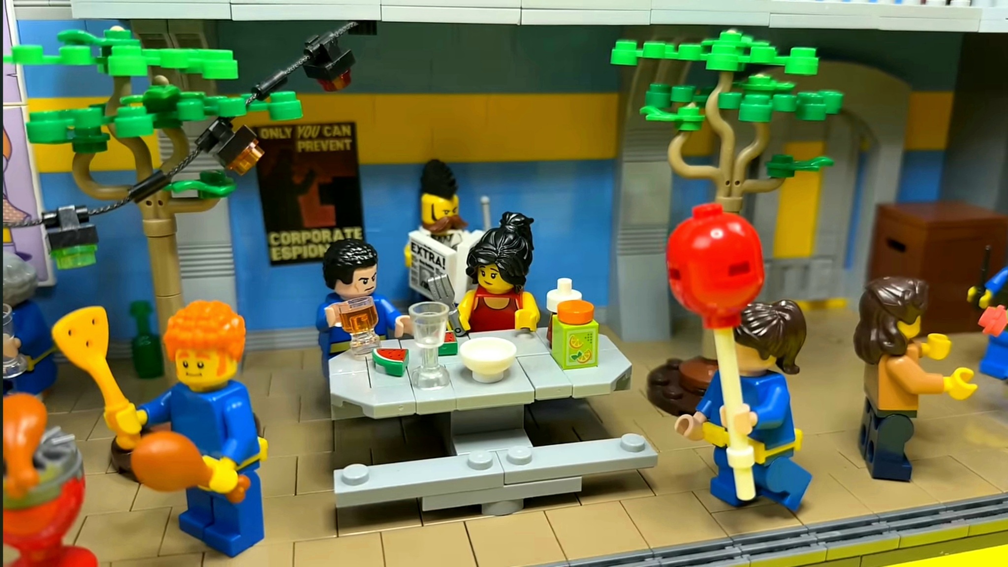 Сразу под входом в бункер расположены жилые помещения. Идея с синими торсо, имитирующими одежду жителей убежища, откровенно скопирована из других (в том числе оригинальных) лего-наборов, но смотрится все равно стильно. Телевизор, как по мне, сделан не совсем удачно, больше похож на ретро-микроволновку (но я и так не сделаю, так что идем дальше)
