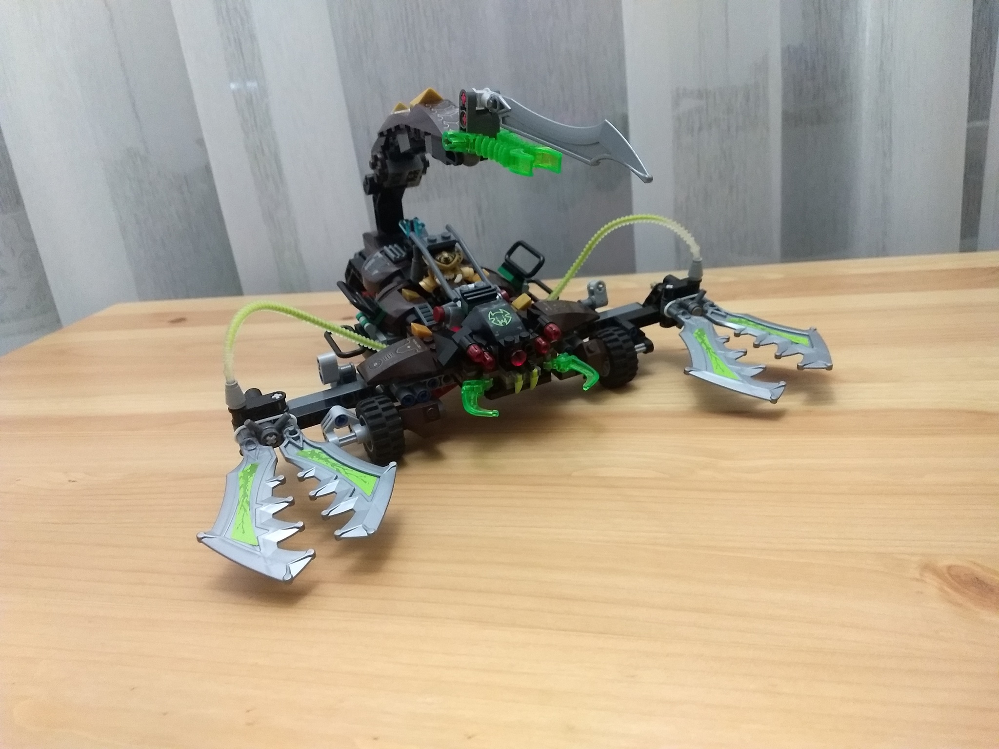 В наборе 400+ деталей. В отличии от двух предыдущих всего одна модель, но по сборке и конструкции она самая интересная. Скорпион умеет клацать клешнями, шевелить жалом и бодро кататься. В кончик жала вставляется шар и им можно стрелять. Я эти шары по глупости отсортировал то ли в мусор то ли в пакет с не оригиналом. Попробую найти, по памяти их мне встретилось штуки две или три из пяти.