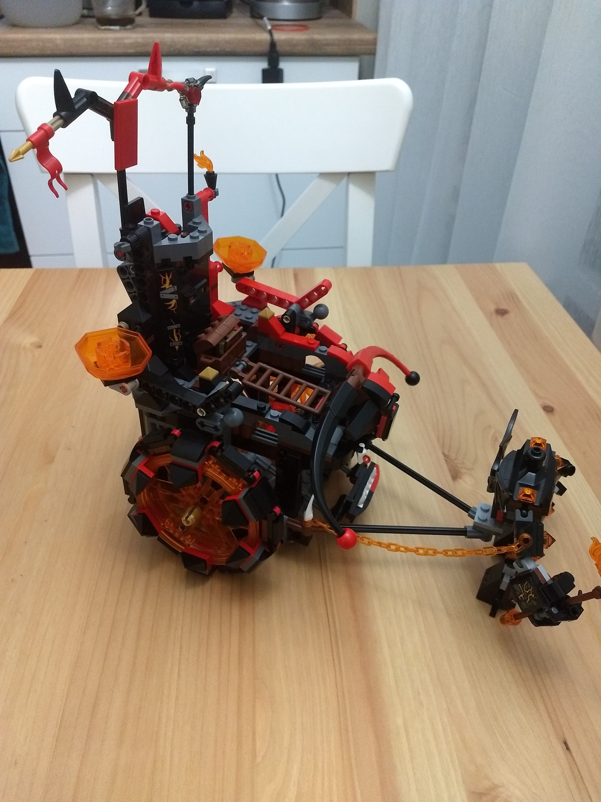 В наборе 650+ деталей. Конструкция весьма интересная, но набор, как мне показалось, не сильно располагает к творчеству. Много деталей украшений, мелких и соединительных деталей. Имхо, это хороший набор-дополнение, если нужна куча соединительных элементов классического лего. Сама телега весьма объёмная, есть большая тюрьма. Челюсти в передней части колесницы двигаются при движении, однако конструкция самих колёс и привода механизма челюсти такова что всё это дело работает только на ковре, на гладкой поверхности колёса скользят.