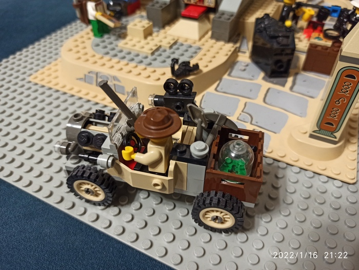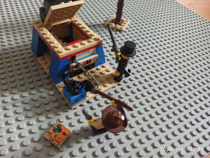 Можно сказать, мой любимый набор, у меня сохранились даже коробка. Ландшафтная плита великолепная. Много фигурок, много аксессуаров, машина, палатка, сокровища, много карт, динамит, лупа, бинокль (единственная деталь которая утеряна), да и тут много всего.