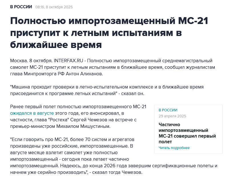 Простой вопрос требующий простого ответа: Самолет в небе летает или нет? Что может быть проще? Ты сам себя загнал в угол и теперь не можешь дать простой ответ на простой вопрос. Так может быть не стоило тупить изначально и пытаться доказать что летают только серийные самолеты? ВСЕ самолеты летают. И фраза конструктора при запуске серийного производства - мой самолет полетел - означает лишь что проект его полетел. А самолет его летал и до серии, на испытательных полетах. И я был прав изначально написав что МС-21 уже летает.
