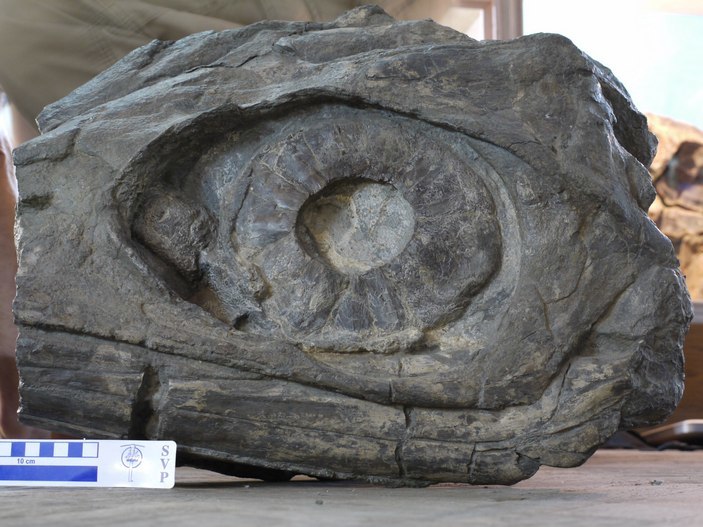 Фрагмент черепа ленинии со склеротическим кольцом в глазнице. Фото © П. Годефруа