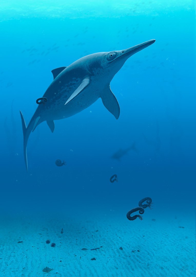 На реконструкции изображен ихтиозавр мелового периода, обитавший в Поволжье и получивший название лениния звездная (Leninia stellans), которое принесло животному курьезную известность.