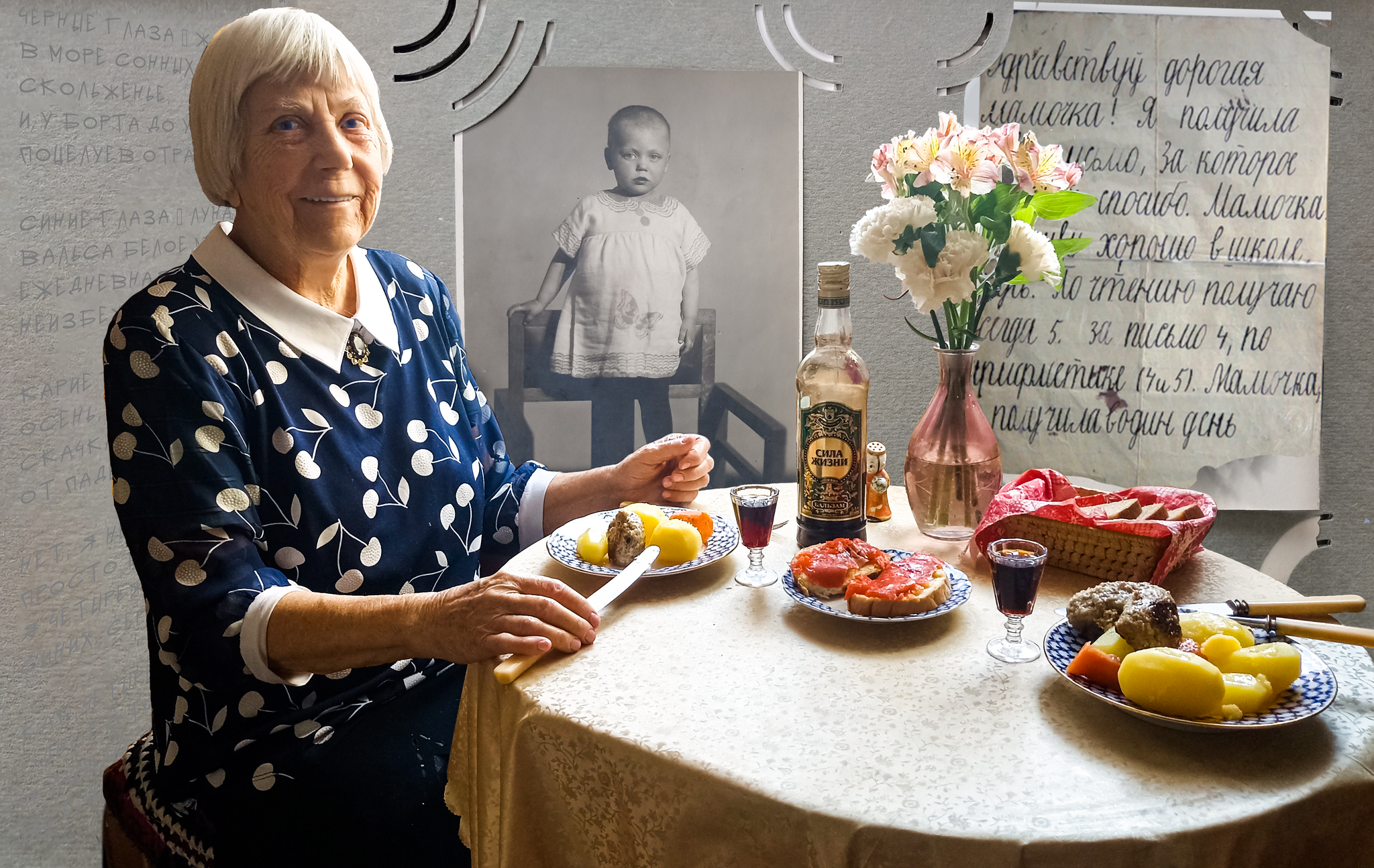 Мы сидели за накрытым столом. Отварная картошка, морковочка, котлетка – простая, но такая душевная еда и маленькая лафитная рюмочка бальзама с символическим названием «Сила жизни». Регина Романовна словно делилась со мной частичками того, ещё довоенного, уюта и любви большой семьи Гинденберг, которые не смогли отнять ни война, ни блокада, ни смерть.