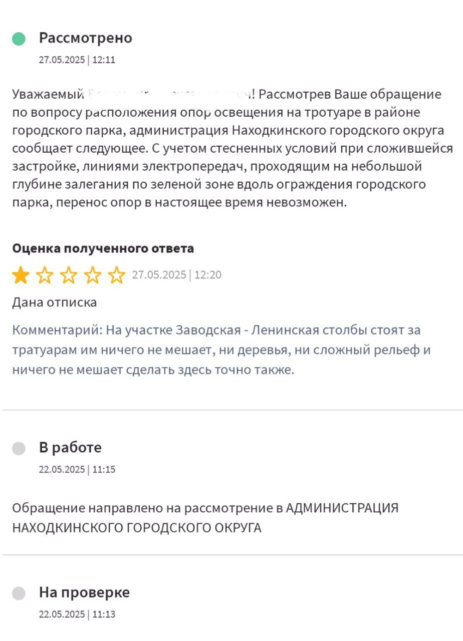 Пишем - «Дорога на Находкинским проспектом за Парком отдыха, между остановками Моручилище и Рыбный порт. Столбы нужно переместить за край тратуара. Они мешают проходу людям, родителям с коляской и инвалидам на и6валидных колясках.»