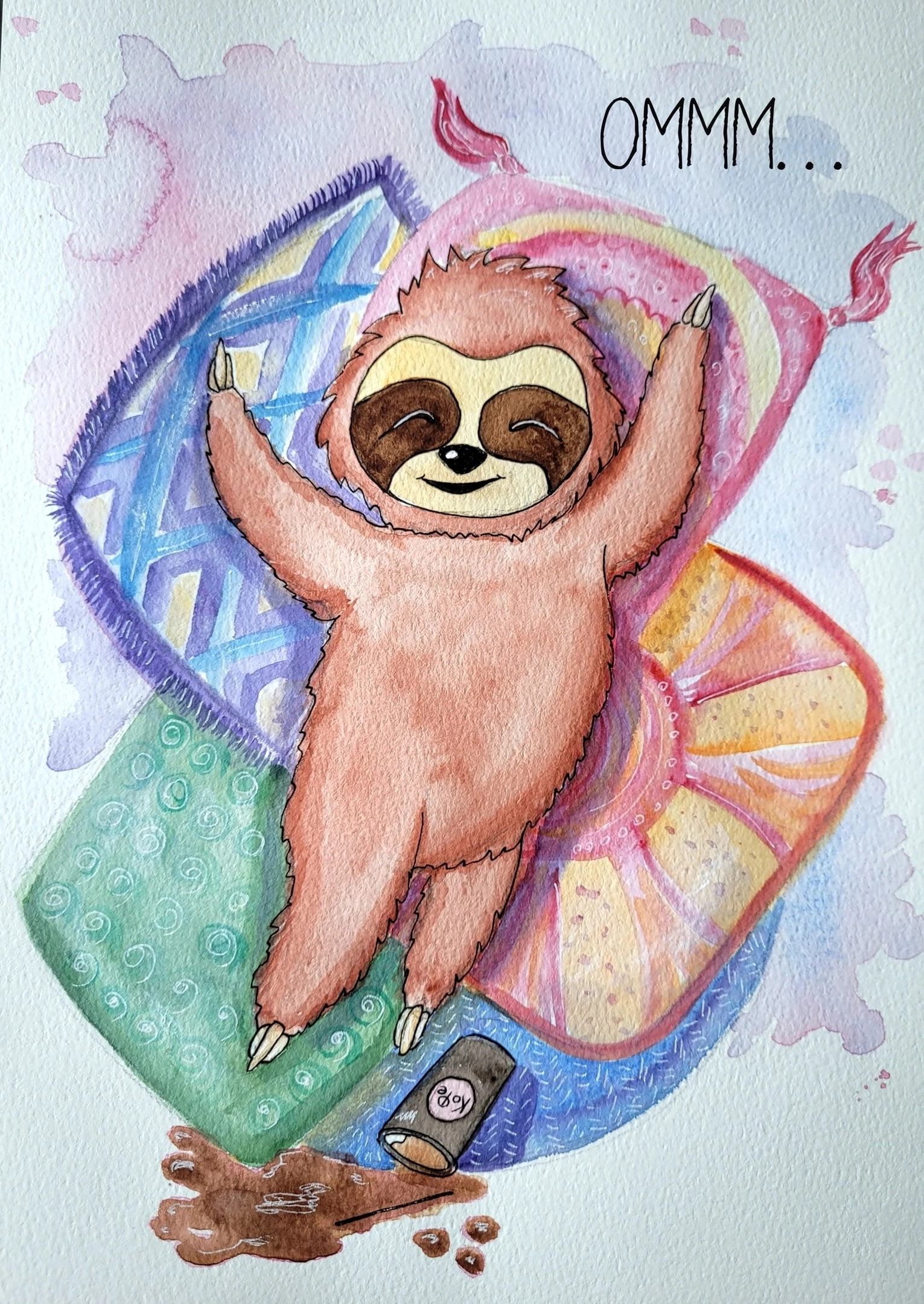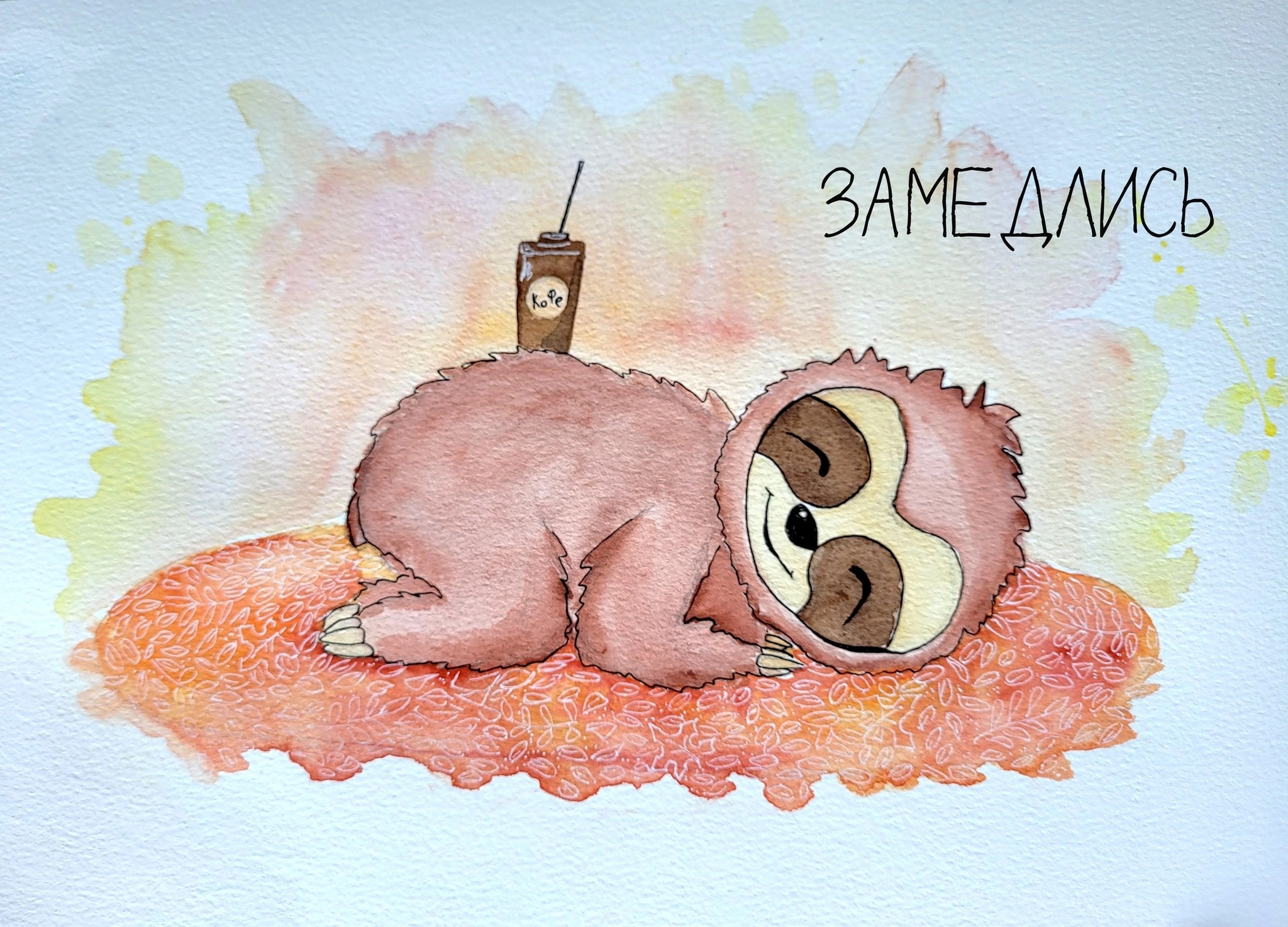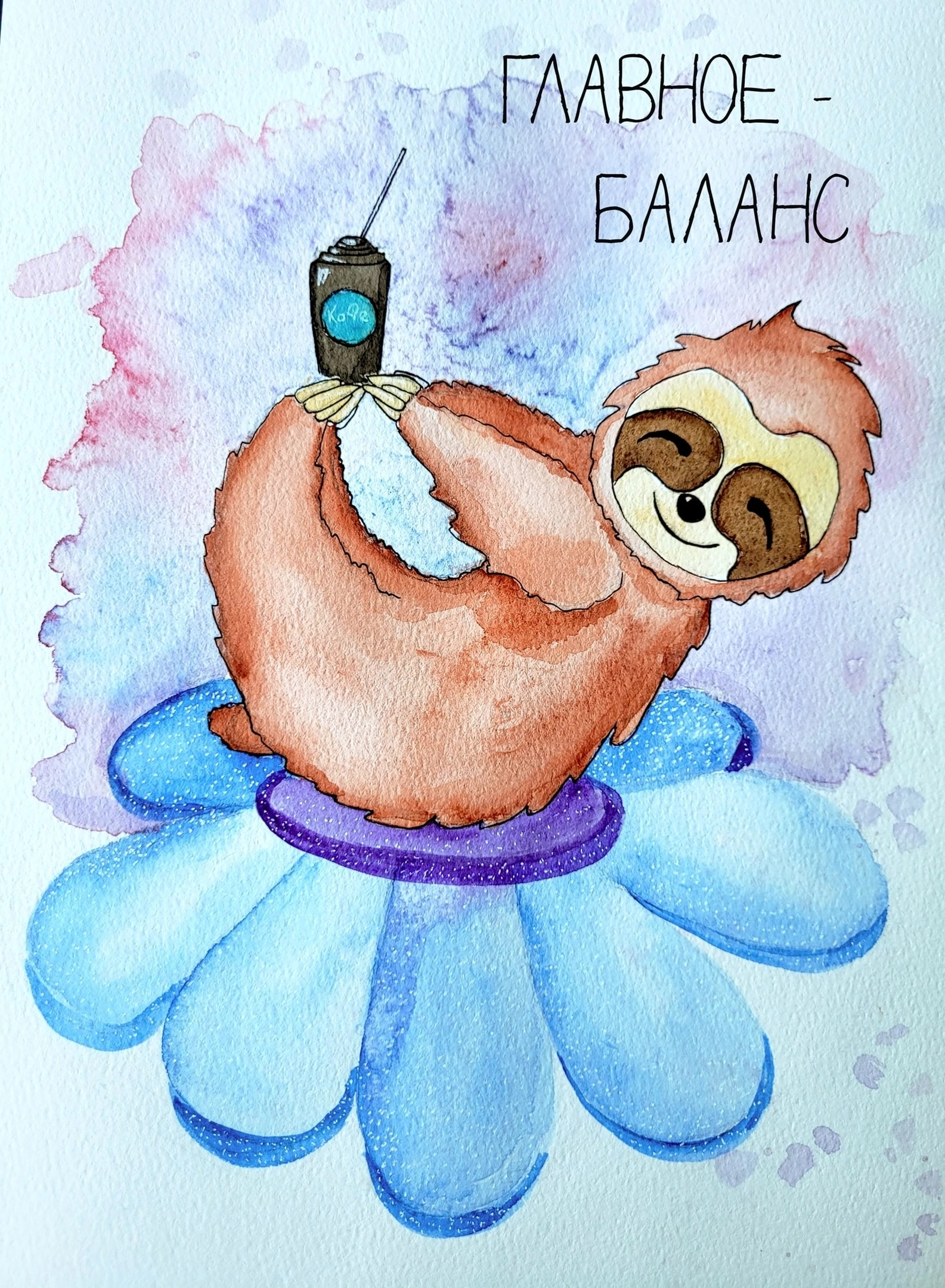 Тема была: ленивцы - йоги. Добавили чуть изюминки от заказчицы, которая очень любит кофе. Поэтому ленивцы все со стаканчиками)))