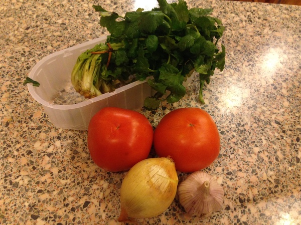 Средне рубим кинзу, засыпаем специи, добавляем уксус и хорошенько разминаем. Ууух какие ароматы! Затем чистим лук и чеснок. Измельчаем в блендере. Можно меленько нарезать. Добавляем к кинзе. Перемешиваем и разминаем еще. Помидоры нарезаем и тоже в блендер. Добавляем ко всему остальному. Перемешиваем, добавляем томатную пасту. Пробуем на соль. И убираем в холодильник.