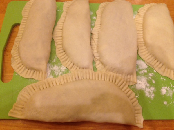 От души накладываем начинки – для себя же делаем! Залепляем края и проходимся вилкой. Вот такие примерно получаться чебуреки.