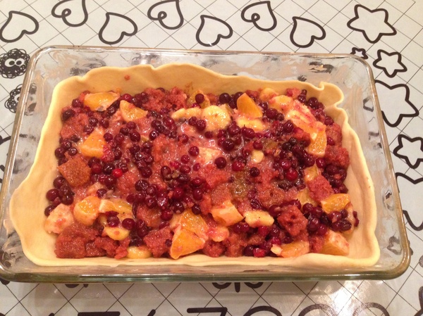 Смазываем емкость сливочным маслом. Раскатываем два коржа. На первый выкладываем начинку, вторым накрываем. Делаем в центре небольшую дырочку и в горячую духовку на 30-40 минут при 220 градусах.
