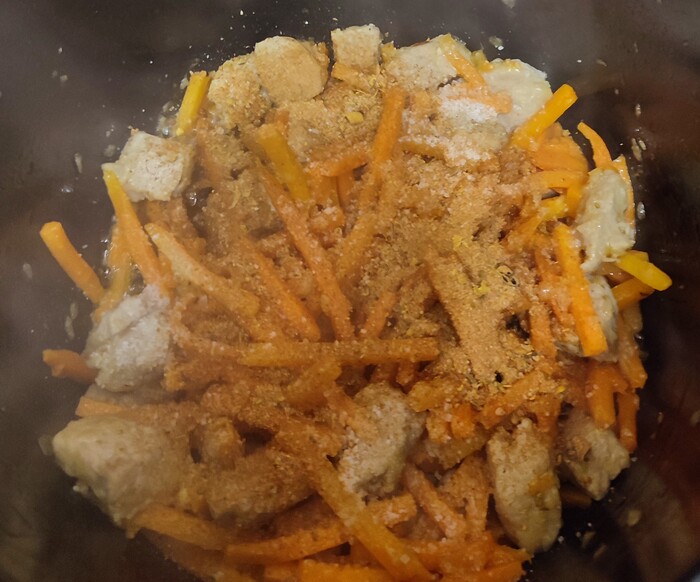 В процессе мясо даёт сок несмотря что перед закладыванием я его несколько раз сливал, это не страшно, сок подберёт морковь. Пришёл её черёд