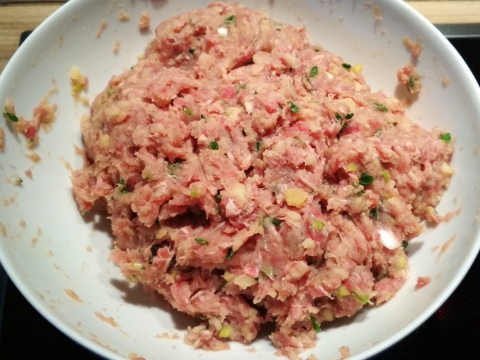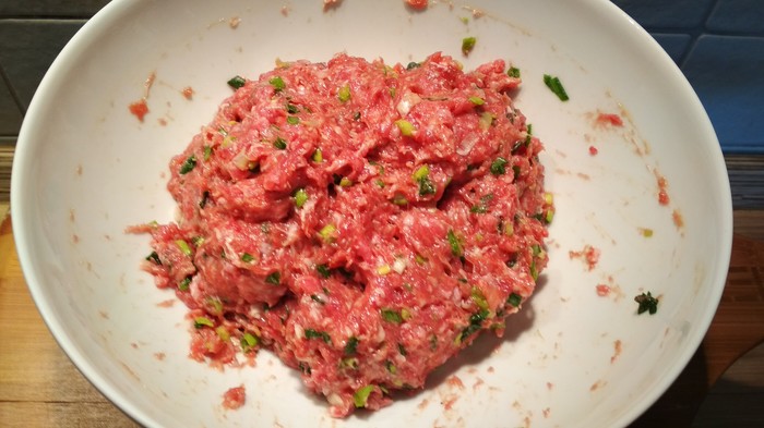 Я купил в мясном магазинчике 550 грамм свино-говяжьего фарша. Предпочел бы чисто говяжий, но его не было. Это не принципиально. Китайцы так, вообще чаще всего готовят свинину.