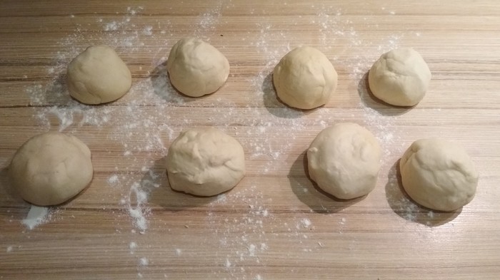 Делим тесто на восемь примерно одинаковых кусочков. Подкатываем их в шарики.