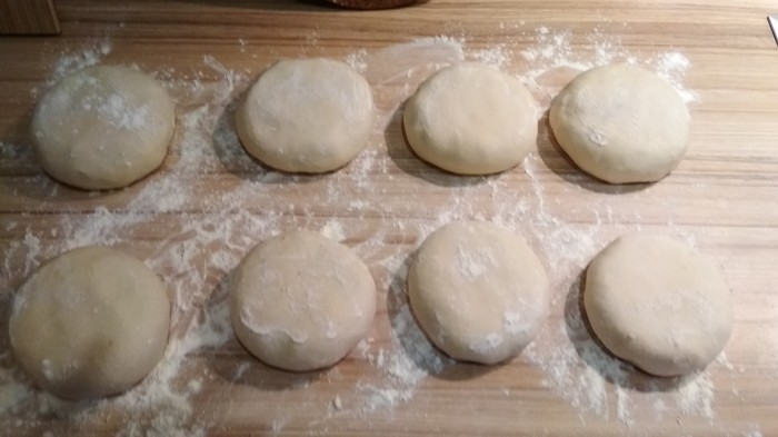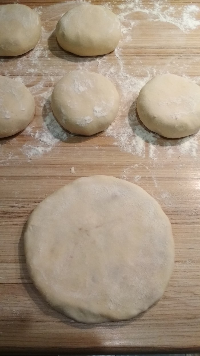 Слегка приплюснув выкладываем наши заготовки на подпыленную мукой поверхность.