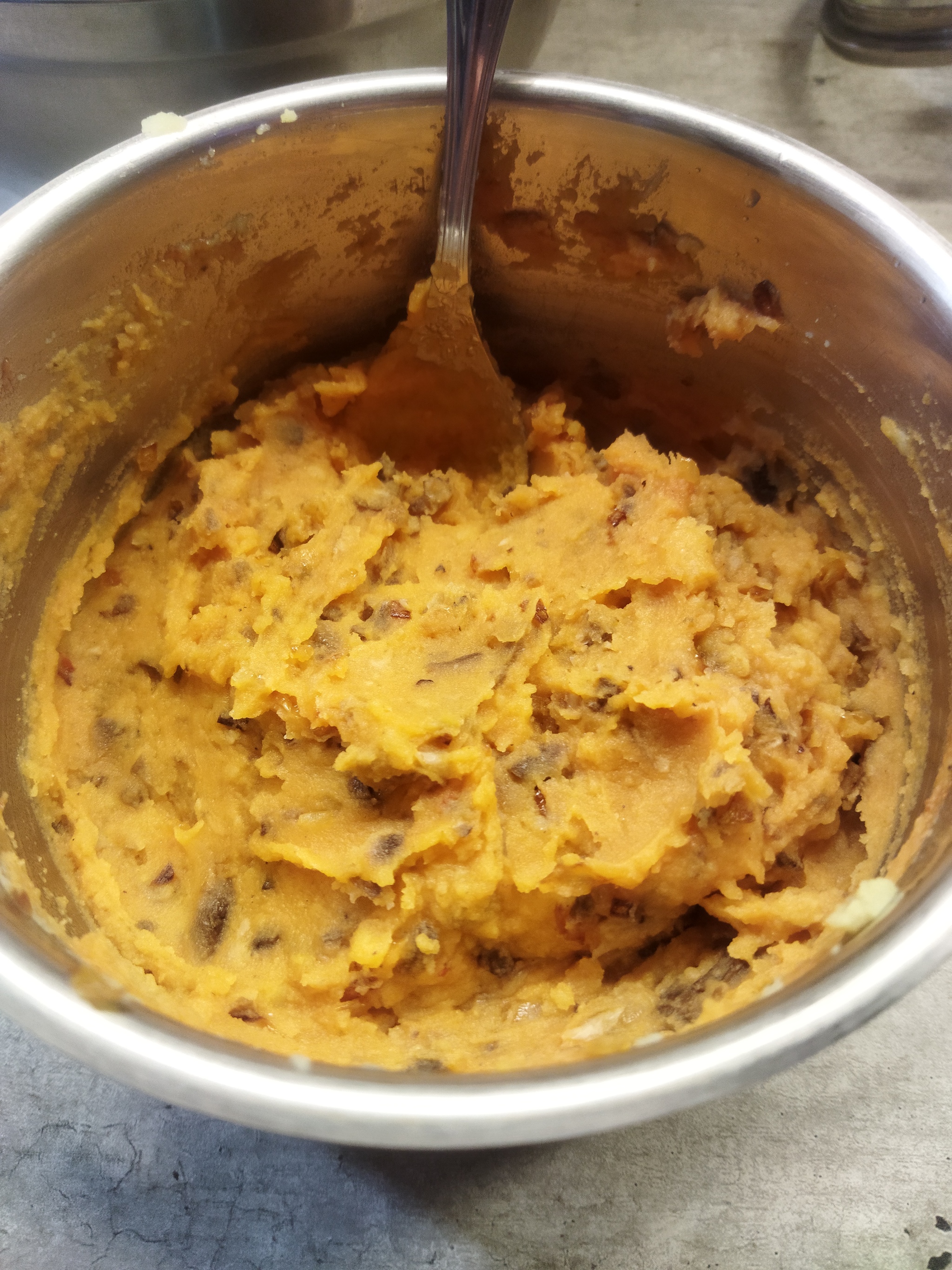 Незамедлительно не дожидаясь остывания присоединяем к пюре грибы с луком.