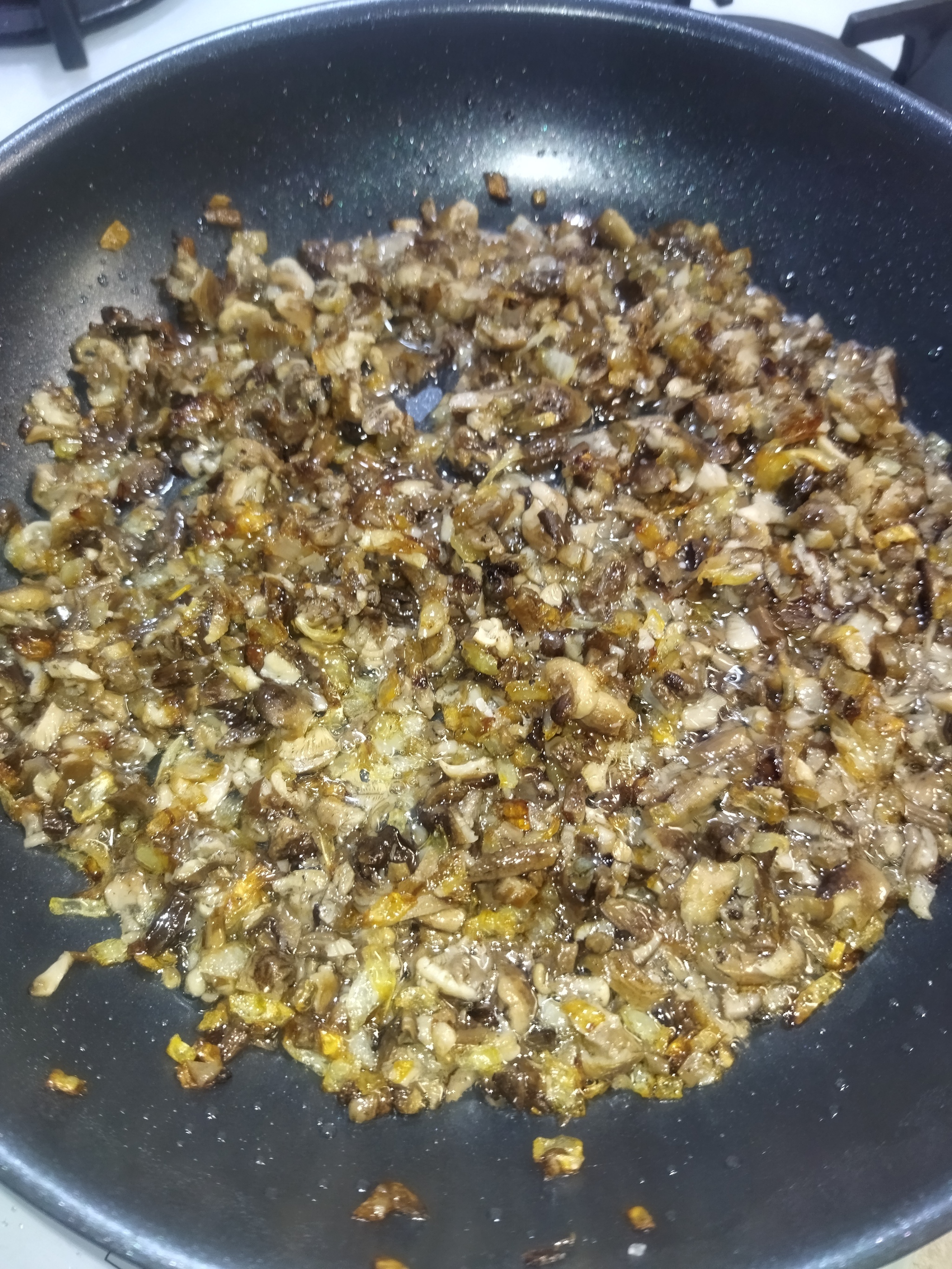 Пока занимались с лукомгрибы уже сварились. Откидываем их на дуршлаг, дав стечь жидкости мелко крошим и добавляем на сковороду к луку. Оставляем на огне буквально минуту, не нужно чтобы грибы прижарились, они просто должны избавится от поверхностной влаги.