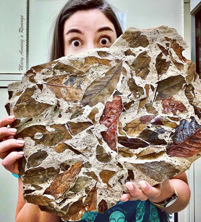 Палеонтолог Эми Л. Атуотер с окаменелые листьями потрясающей сохранности, обнаруженными в нижнеэоценовых (~50 млн лет) отложениях долины Уилламетт в западном Орегоне.
