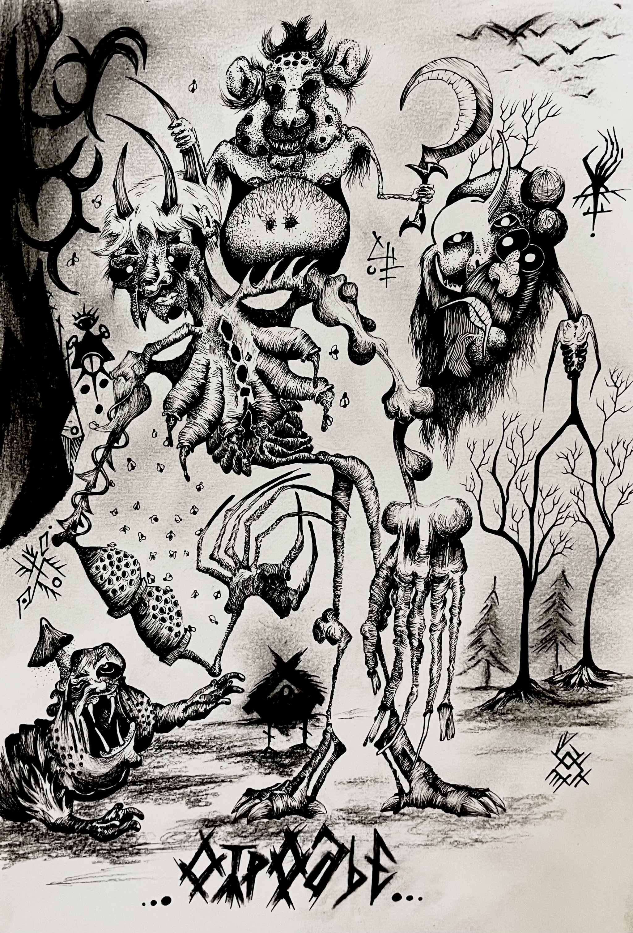 -Чертов дед. Тонкое, высокое существо, немногим уступая Матери гнуса в росте. Все тело его покрыто корой, а ноги так и вовсе похожи на тонкие деревья. Ветки которых круглый год без листьев. Голова как мешанина из двух лиц: испуганное и злорадное. Охотится на зверей, поджидая когда те будут проходить возле его ног. Протыкает руками-кольями и пожирает. Ходя по сорному тонкому лесу, чаще смотрите на верх, возможно сверху уже наблюдают. Боится железа. Сам по себе передвигается медленно, на удары его стремительны.