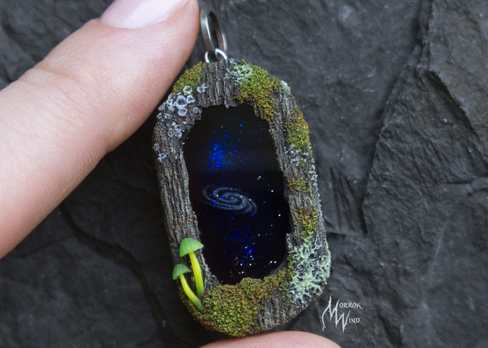 Кулон. Обрамление - полимерная глина +пигменты. Космос объемный - материал смола, сверху стеклянная поверхность.