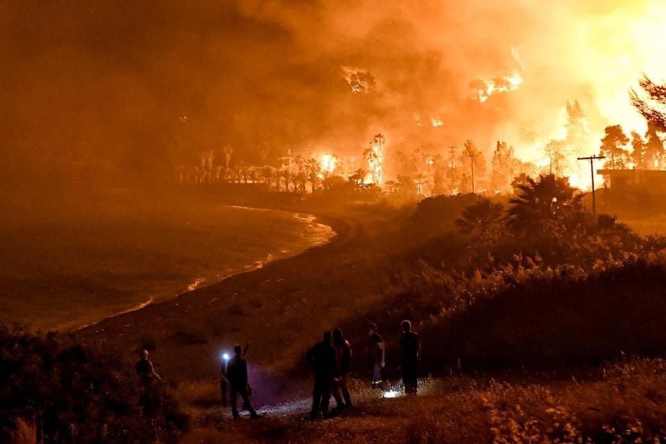 Пожар на Коринфе, в 80 километрах от Афин, начался с оливковой рощи. Огонь быстро распространился из-за сильного ветра. На данный момент, дым от пожара уже дошёл до Афин