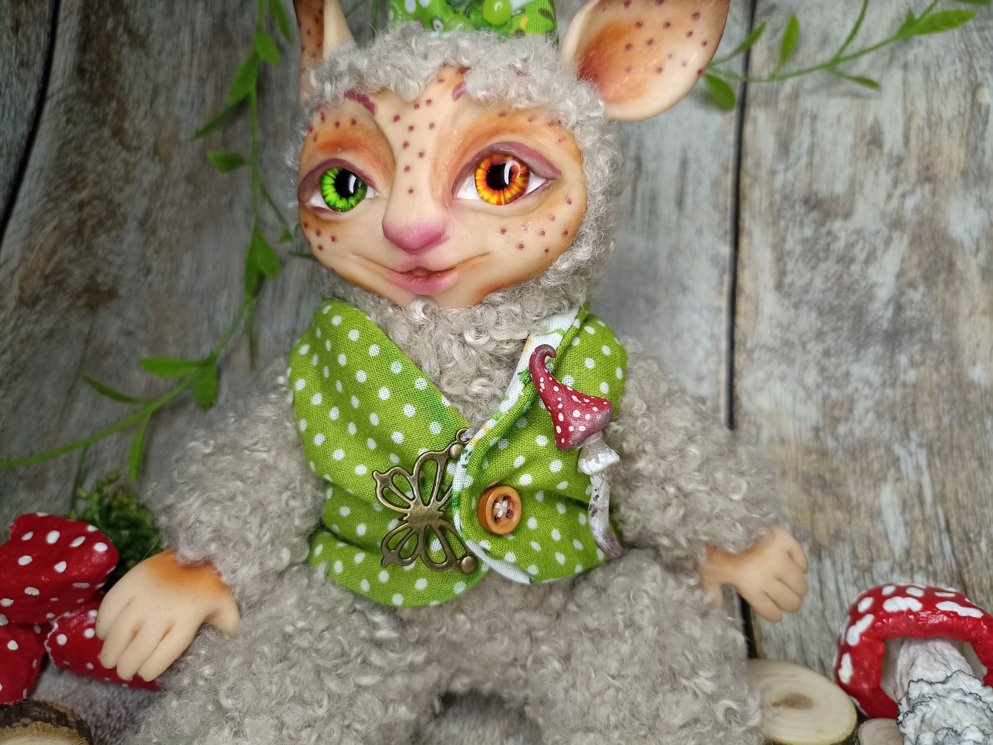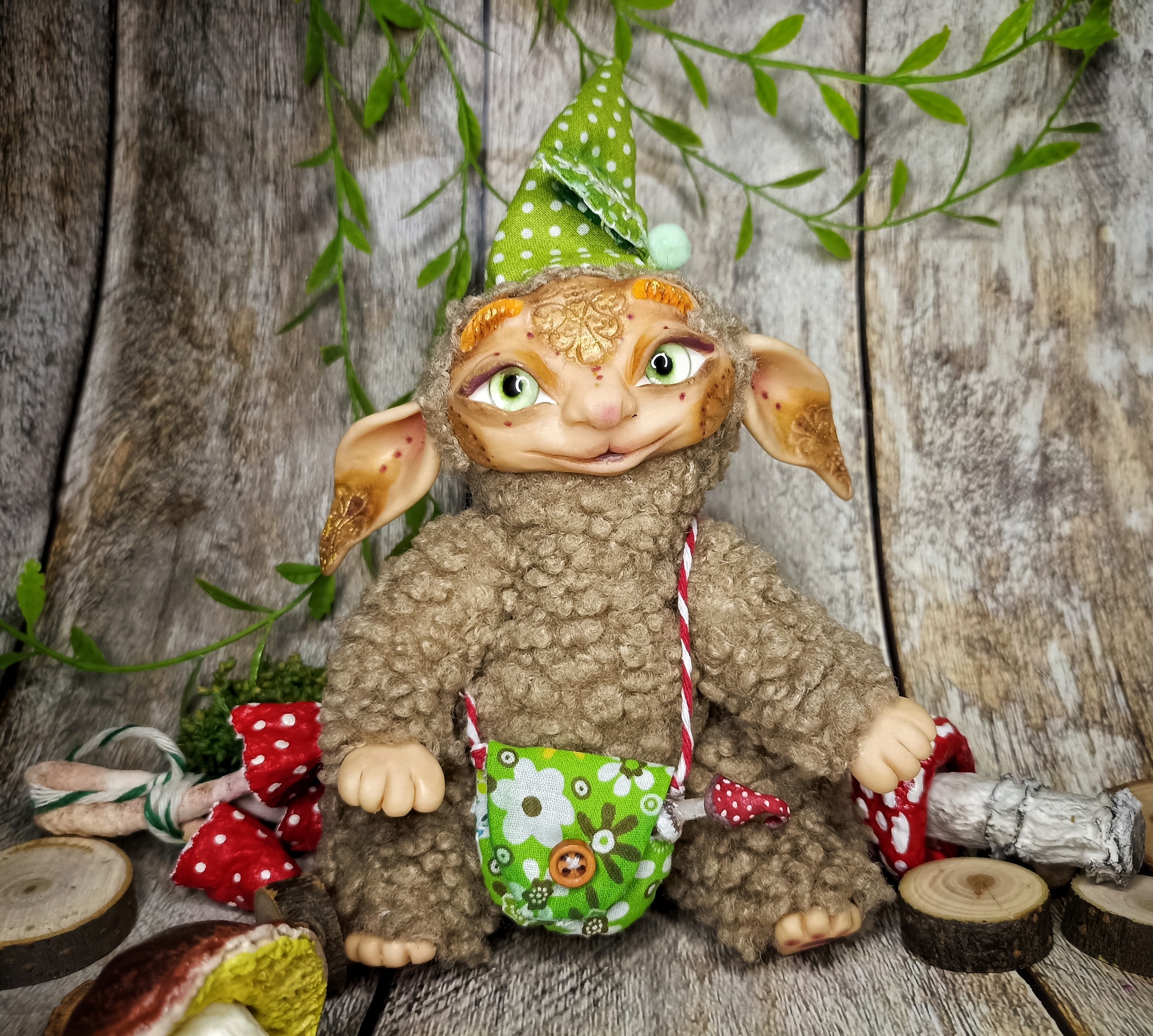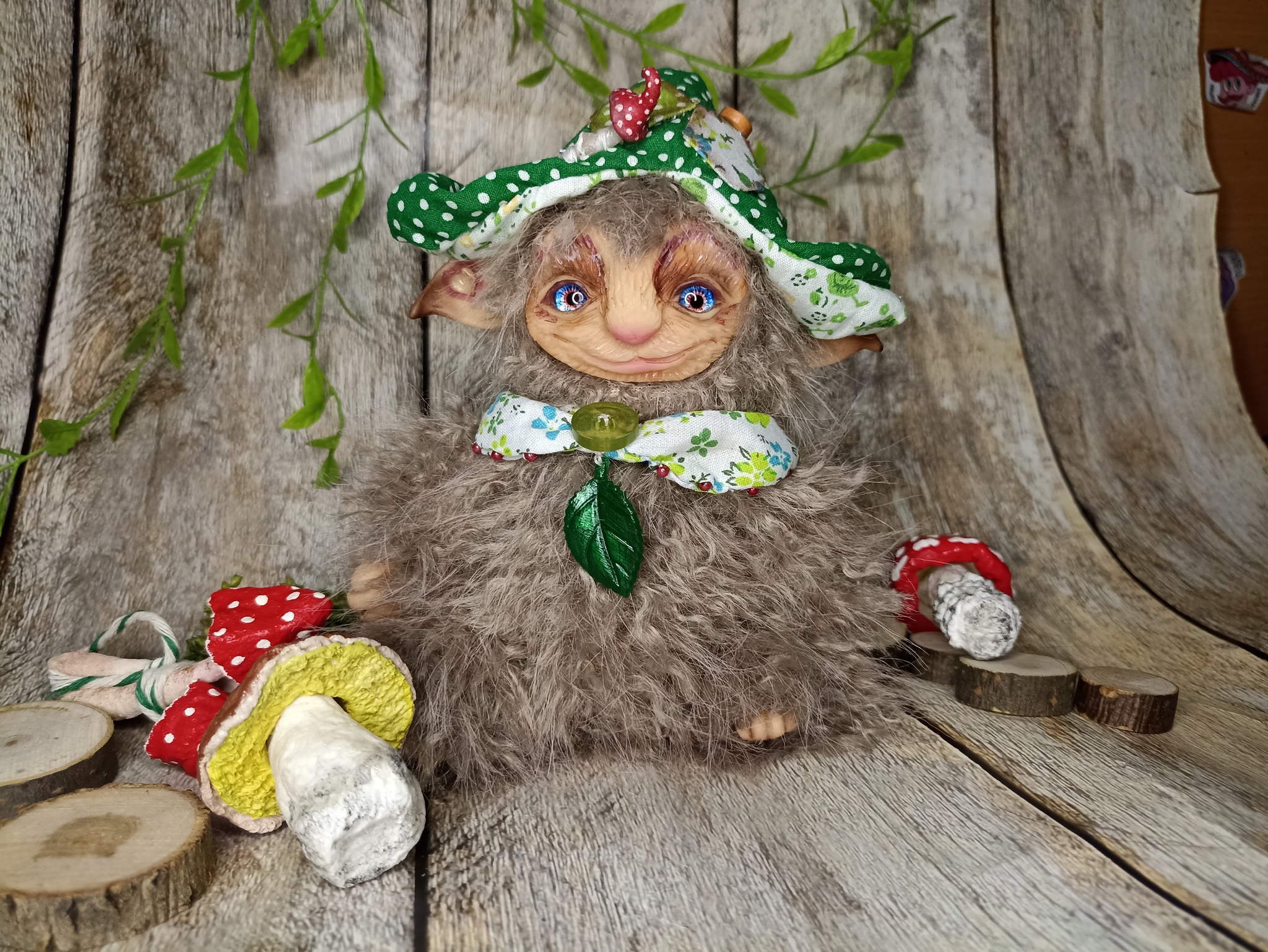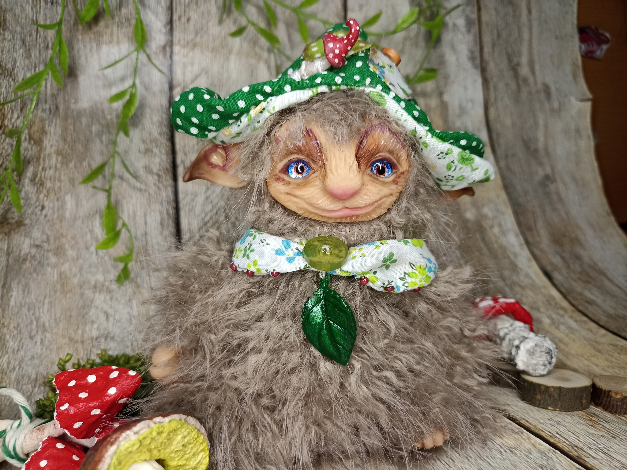 Облик: в забавной шапке с мухомором и воротнике, придающем ему особый шарм. Его внешность — мягкая и пушистая, как мох.