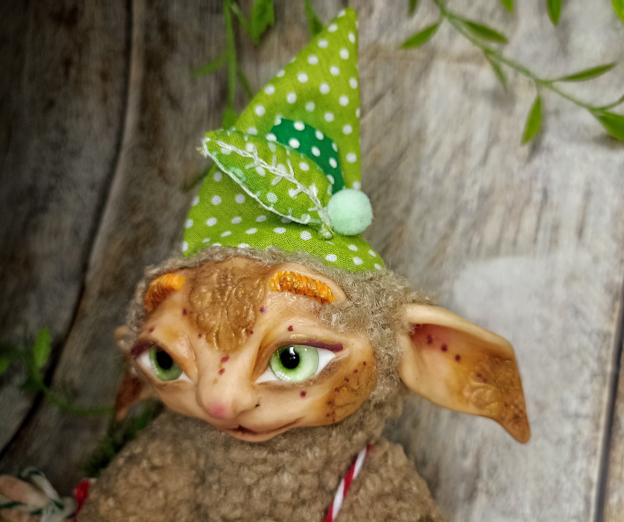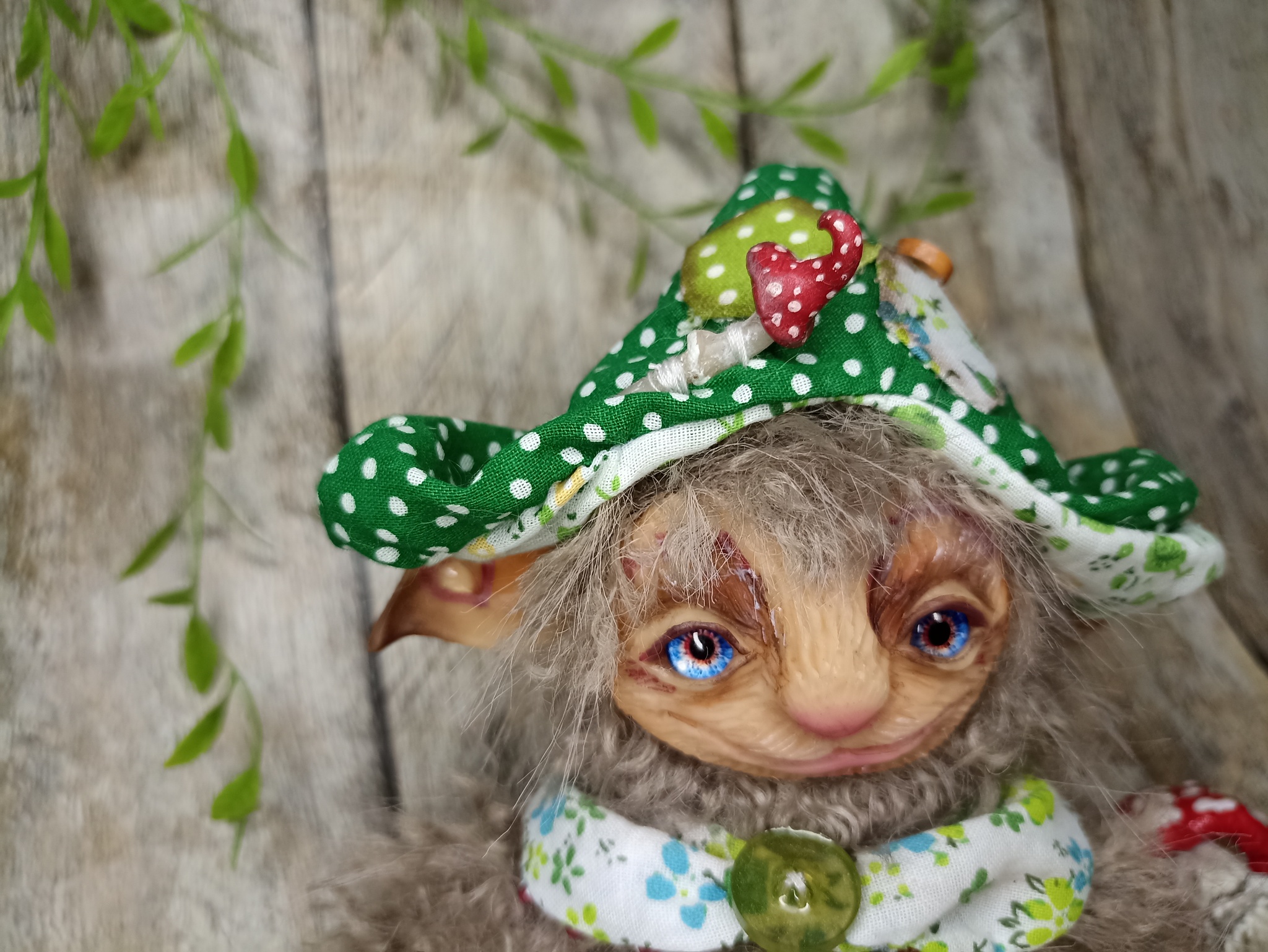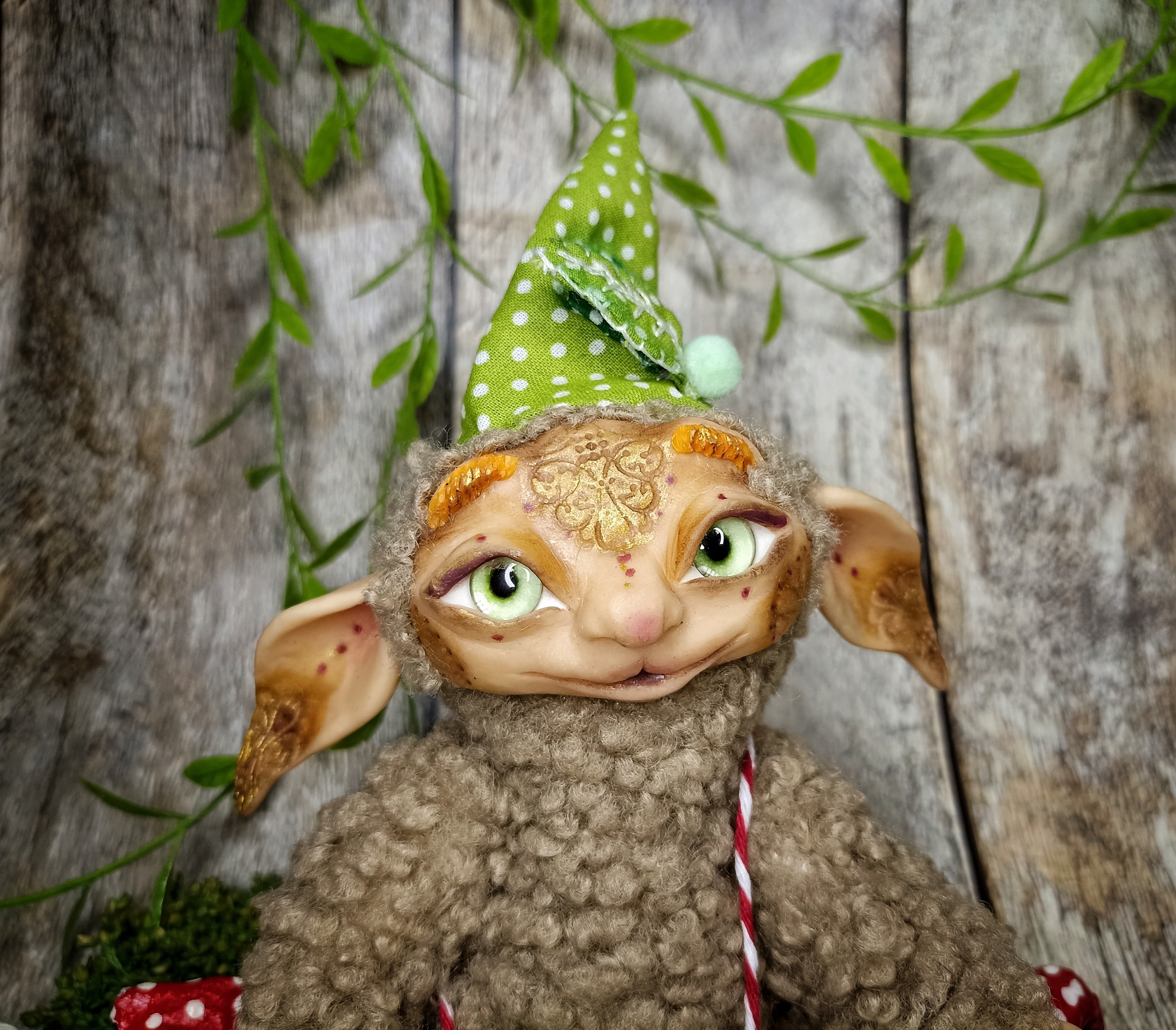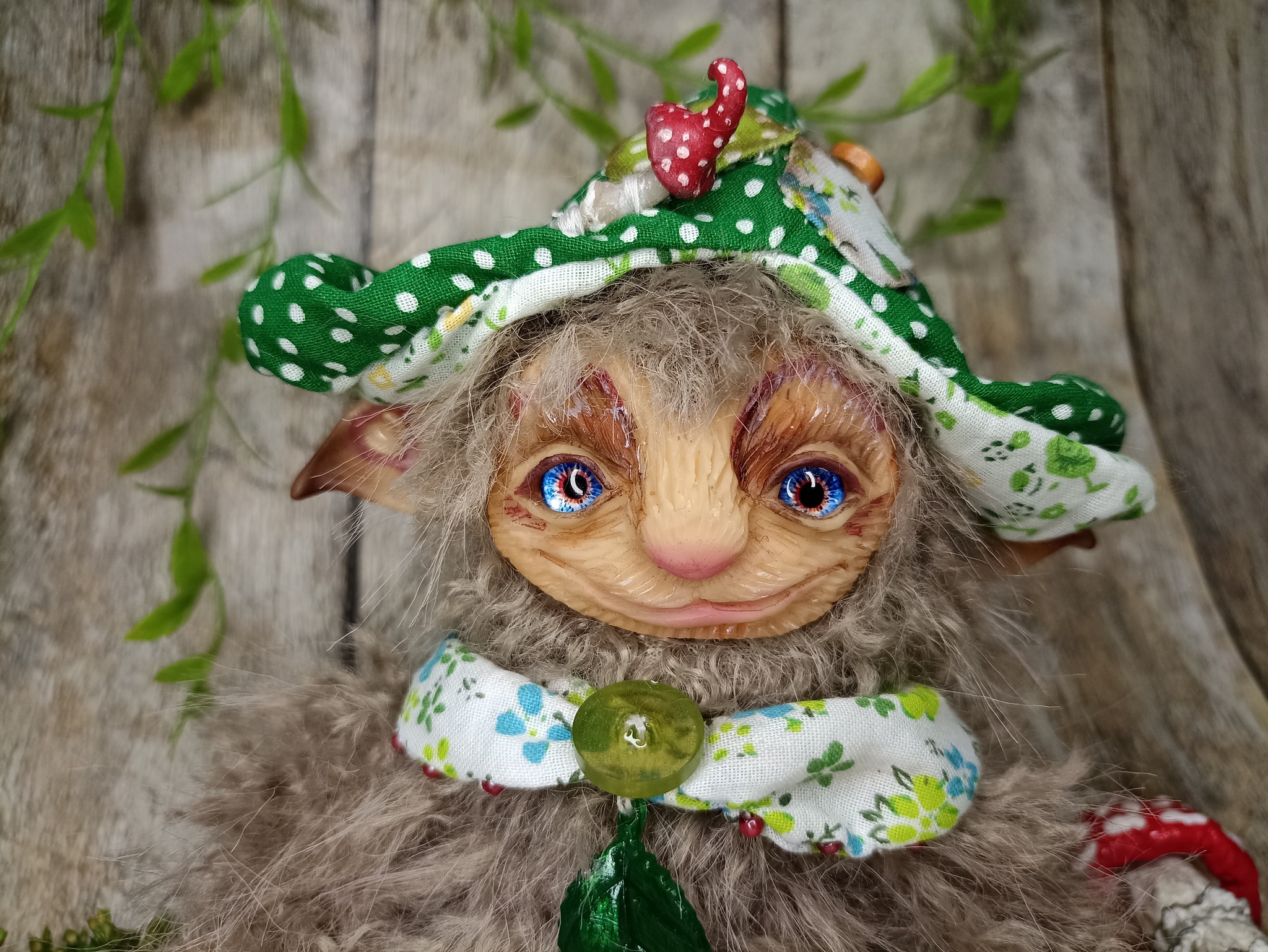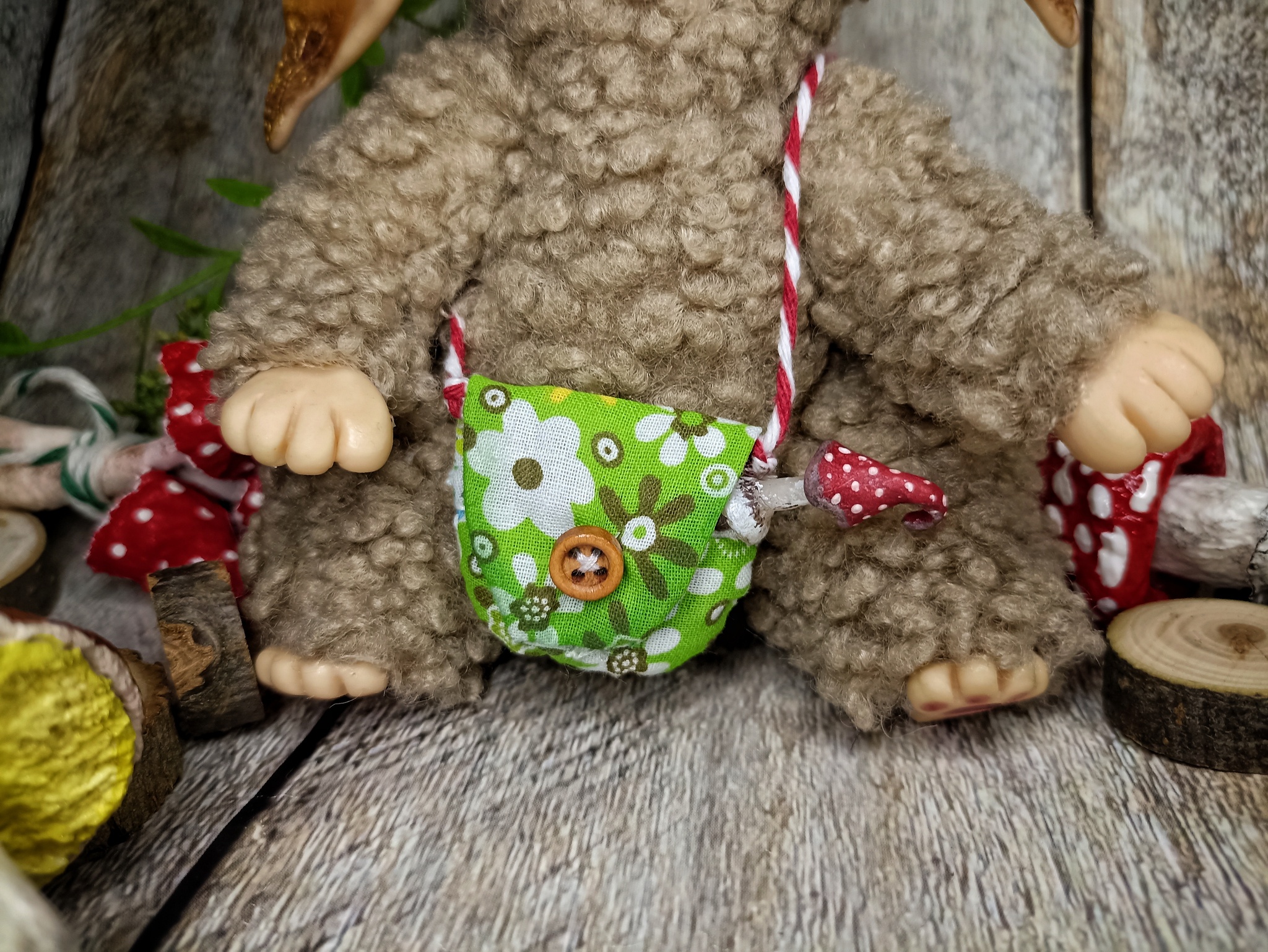 Облик: в забавной шапке с мухомором и воротнике, придающем ему особый шарм. Его внешность — мягкая и пушистая, как мох.