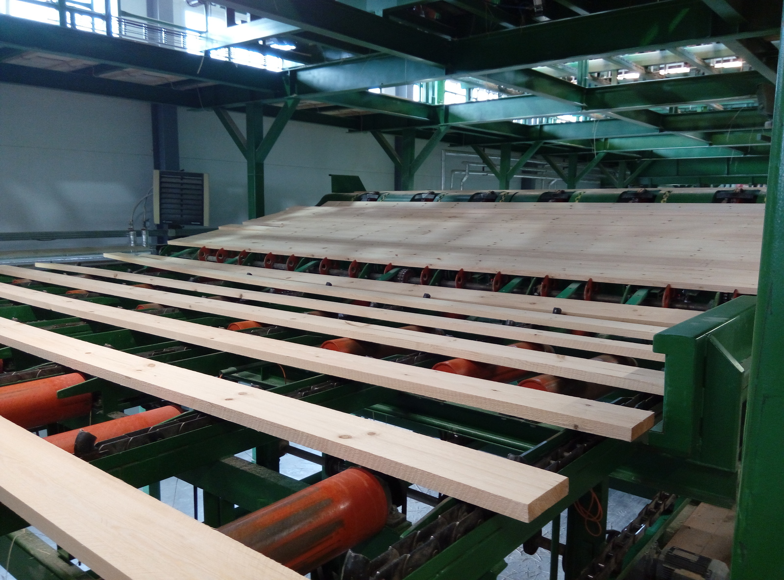 Доски с распиловки выходят на двух транспортеров ( правый это основные доски, левый- это боковые и верхние). На этом этапе можно считать, что доска уже распилена и ею можно грубо говоря пользоваться, но! Влажность у нее достаточно высокая, и когда она начнет сохнуть, она может погнуться ( или наоборот выпрямиться, кто же знает). Именно поэтому на лесопильном комплексе готовая продукция сортируется дважды. Именно поэтому на заднем плане находится лифт, на нем высушенная продукция уходит на повторную сортировку.