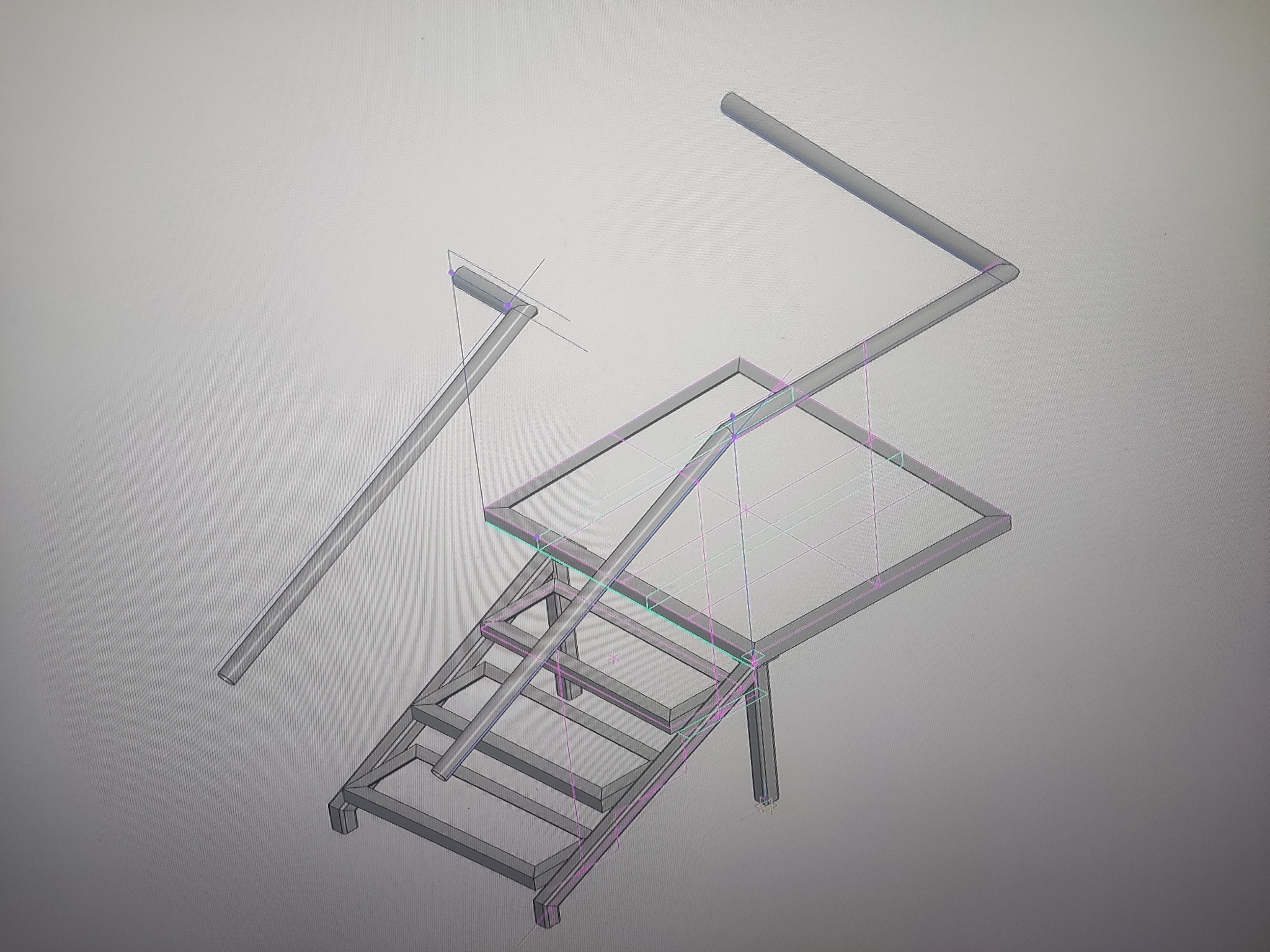 Начал с эскиза, накидал в компасе. Внутренний поручень забанили, что бы легче таскать черезнеë что нибудь массивное. По дороге домой заскочил на ближайший к гаражу нормальный рынок и заказал металл. Рама площадки и ступенек из 50 уголка, ножки и рама ступенек из квадратной профтрубы 60*3. Поручень из круглой ду42. Стойки из 20*2.5. Пластины для крепления ножек из куска листа 6мм. Заполнение ступенек и площадки из протяжно высечного листа.
