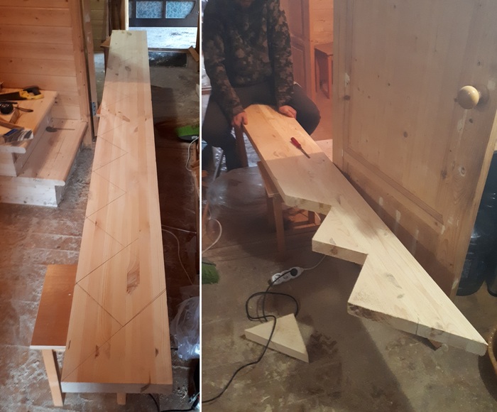 8) Приезжаем на следующий день, берём друзей, благо не пьющих, как и я =) Размечаем по проекту тетиву, понимаем, что вышла херня, размечаем ещё раз и ещё раз, переворачиваем тетиву, так как там уже всё исчерчено. Замеряю, расстояние от верхней ступени (пол второго этажа) до первой ступени (17 см от колодца), делим на количество ступеней (8шт) ставим на тетиве риски, берем большой железный уголок, на нём на одинаковых расстояниях по сторонам крепим винт с гайкой, и получаем готовый шаблон, дальше перемещая уголок от риски к риске размечаем тетиву. Натренировавшись на кошках и брусках, берём циркулярку и прорезаем по разметке, режем не до конца, углы пропиливал ручной ножовкой, чтобы не было сколов дерева и лишних прорезей.