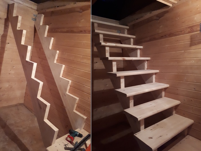 9) Прикладываем тетиву, УРА! Сошлось, используем тот же метод для второй тетивы, крепим на усиленные уголки, та которая у стены прикручена и к стене. Накидал ступенек, дабы посмотреть какая красота. Они не болтаются, сидят ровно и даже по уровню. Конец второго дня, мозг трещит, мыслей вагон.