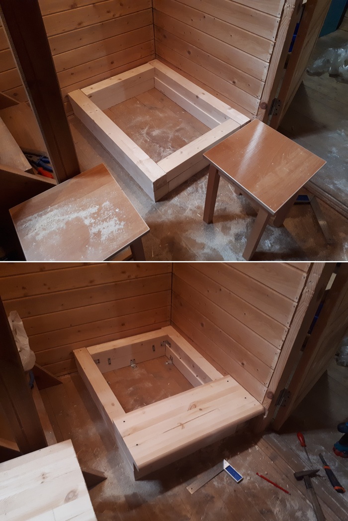 5) Стены, не фига не 90 градусов… Поэтому на месте подгоняем +- 2см… Колодец скручиваю уголками, накрываю ступенькой и доской 4 см толщиной.