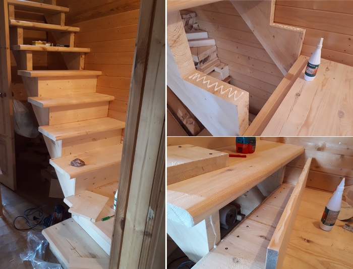 11) Дальше прикручиваем ступени и подступёнки на саморезы, все, промазывая ПВА (говорят, чтоб не скрипело).
