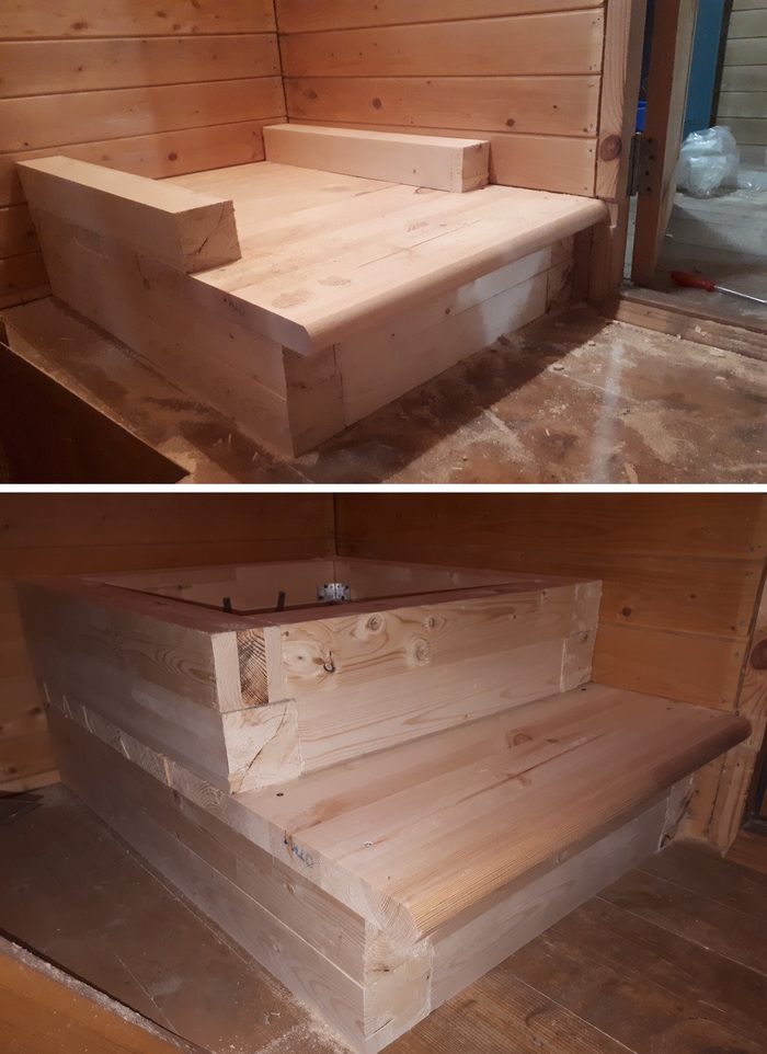 7) Так же зашиваю ступенькой и досками, так как площадка готовая дороже выходит, и так к концу первого дня имеем 2 ступеньки, сидим, радуемся что получилось, быстро ужинаем и уматываем в Москву.