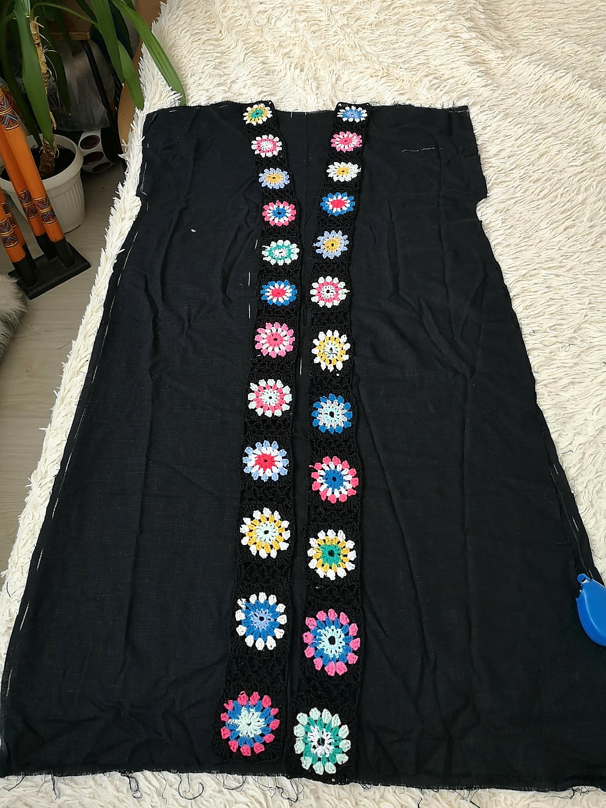 Выбрана материал основы платья - лён. Ткань стираем и отпариваем (т.к. усадку дает). Затем делается выкройка под свой размер (свободного силуэта).