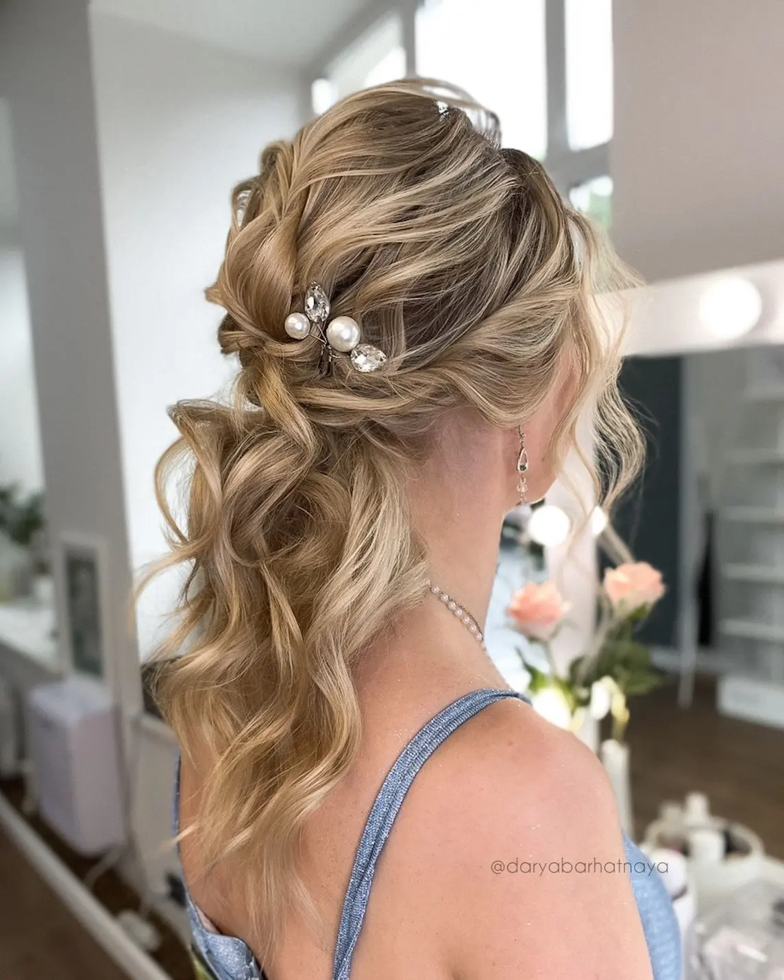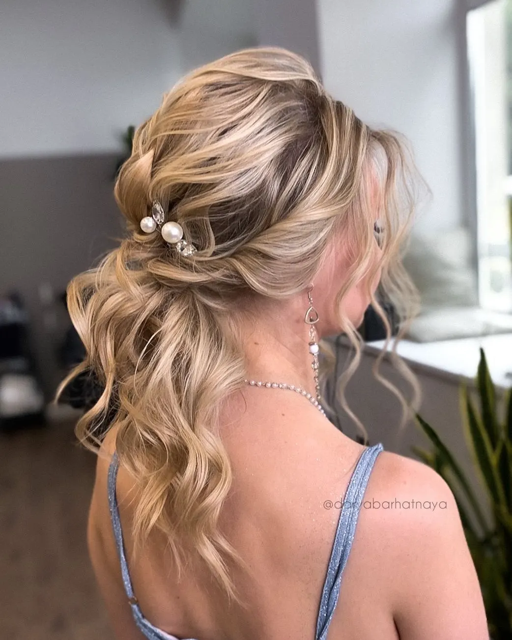 В причёске невесты шпилька с жемчугом и стеклянными стразами класса люкс.