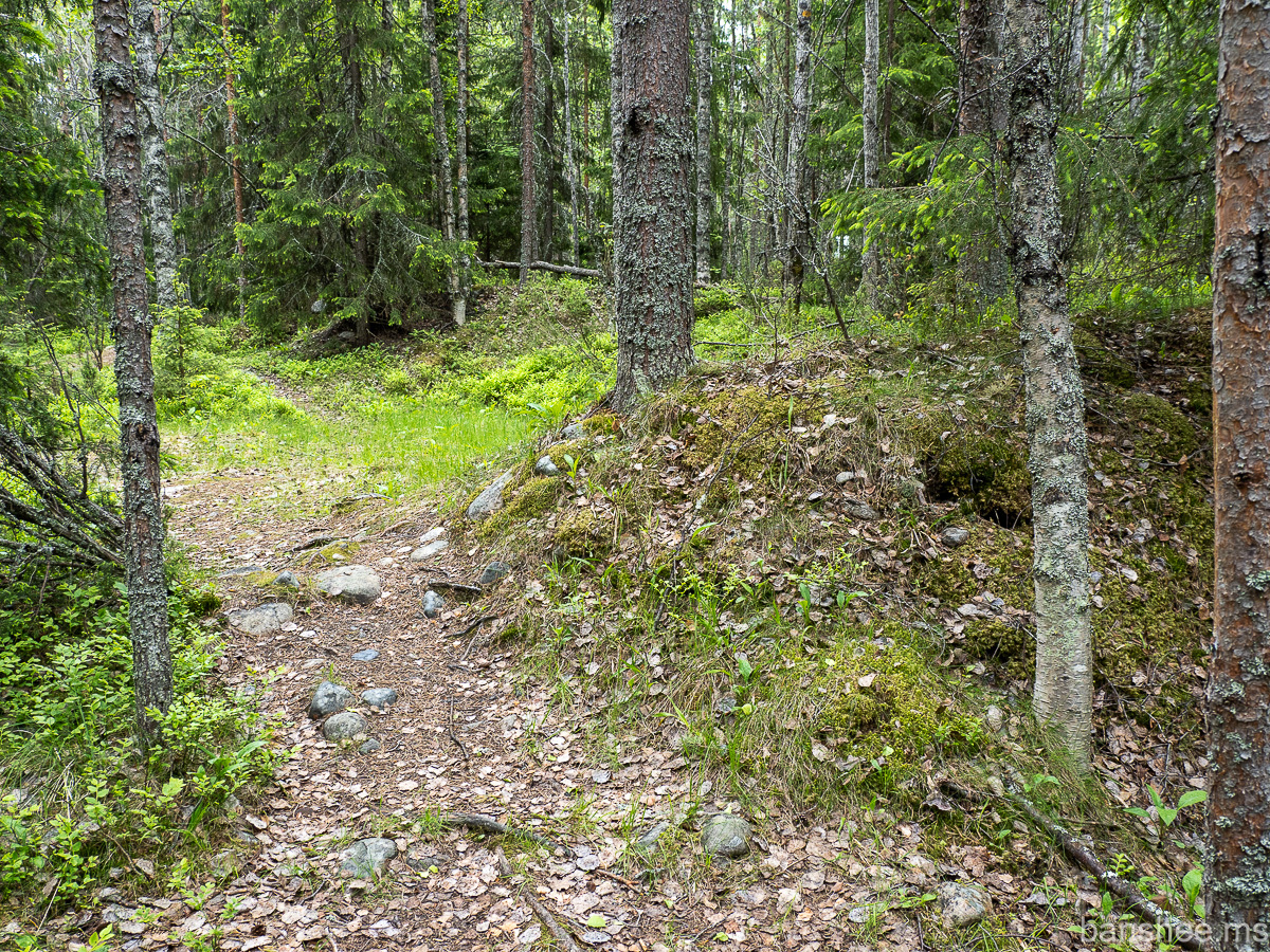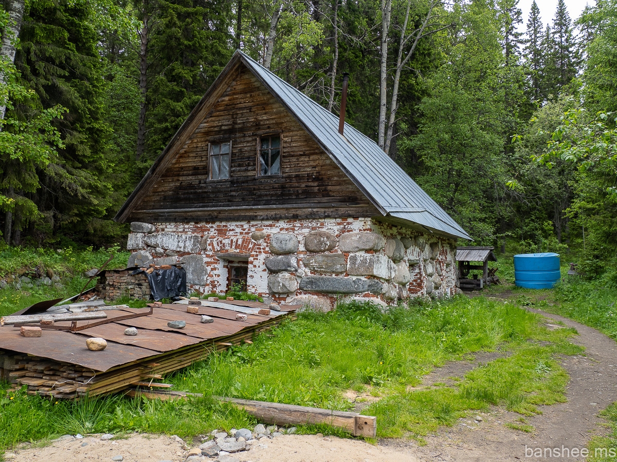 Первое строение на подъёме — валунная баня. Была построена на этом месте из-за того, что рядом получилось вырыть колодец.