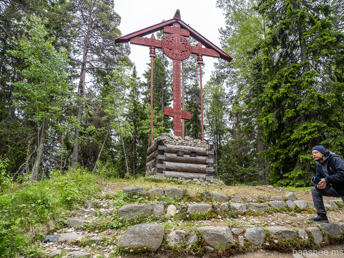 У начала спуска стоит поклонный крест красного цвета, в память новомучеников соловецких. Новомученики — это не все, погибшие на Соловках, а священнослужители, которые находились там в заключении. Не все из них погибли на Соловках, некоторые пережили лагерь и успели ещё лет 20-30 после него по другим тюрьмам и ссылкам помотаться.