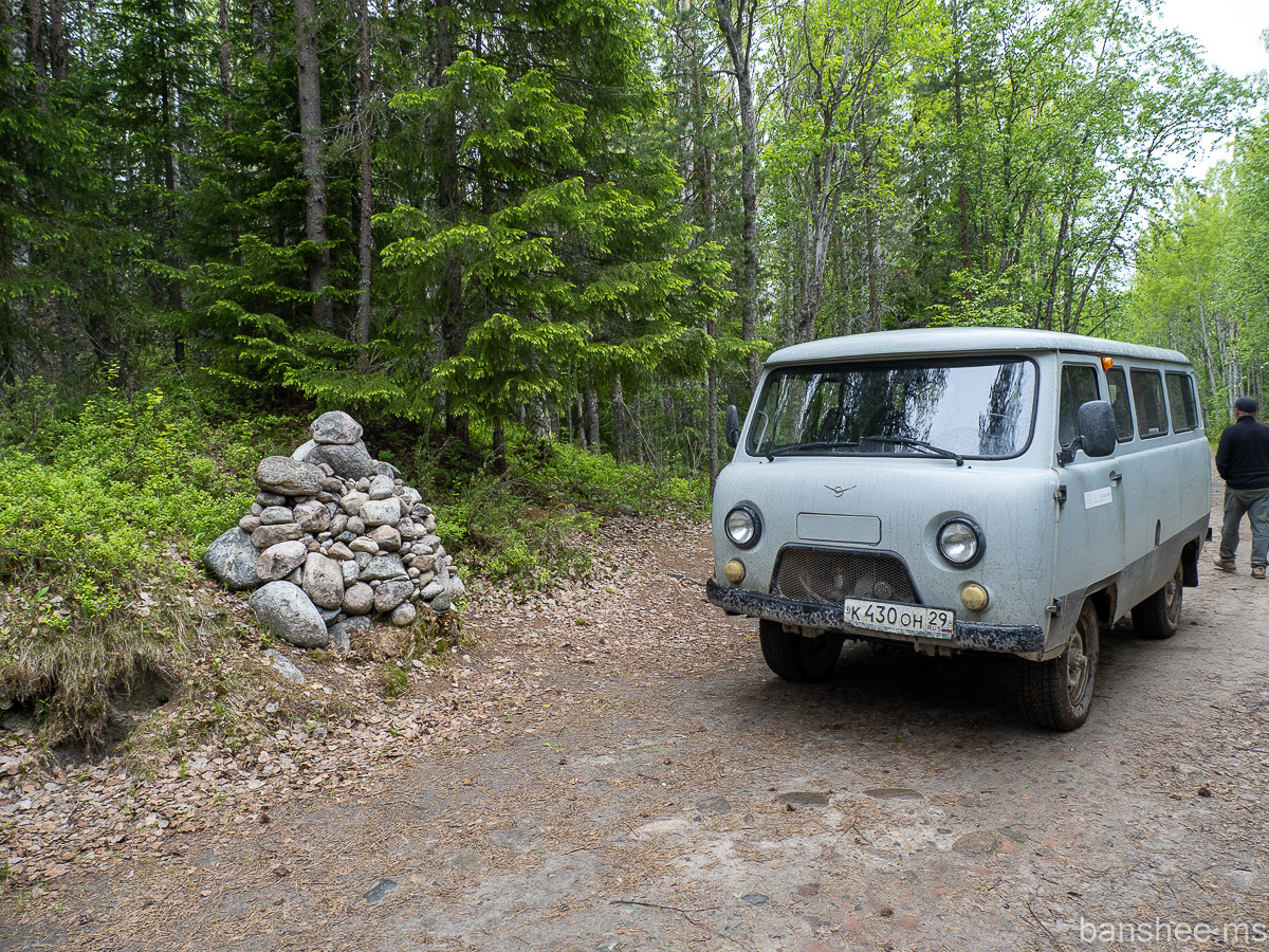 Сами же юнги жили в нескольких километрах от школы, в землянках в лесу. Пирамидка отмечает тропинку к этому месту. Хотя гид сказал, что это творчество водителей, которым делать нечего и в ожидании группы укладывают новые камни.