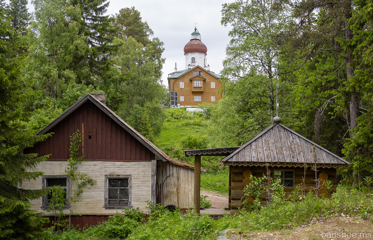 По пути тут ещё был Исаакиевский скит (пустынь), он он закрыт со времени ковида. И, если в Савватьево можно было хотя бы у церкви постоять, то тут разве что у забора огородного можно было встать.