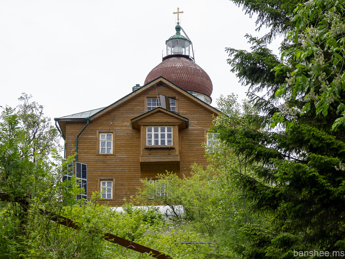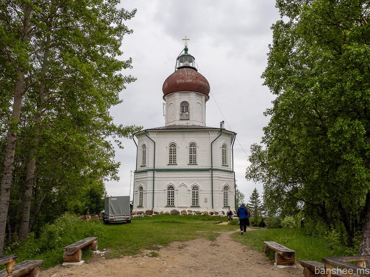 Наверху находится деревянный келейный корпус, из-за которого виднеется купол церкви Вознесения Господня, совмещённой с маяком. Церковь построена примерно в 1860 году и маяком задумывалась сразу.