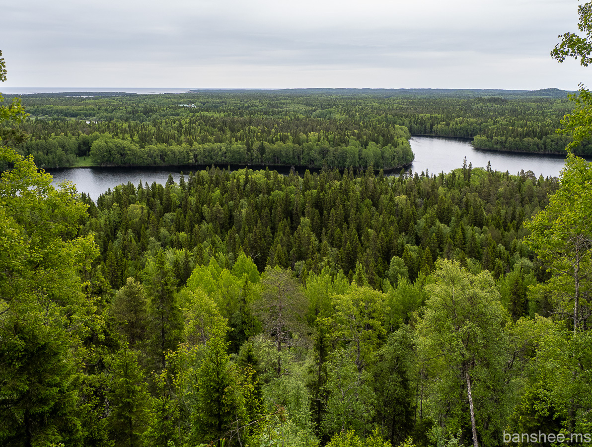 А вот сектор обзора с этой площадки ограничен, несмотря на то, что это самое высокое место на острове. Можно смотреть только на северо-восток — на озеро Долгое, а в остальные стороны мешают смотреть деревья.