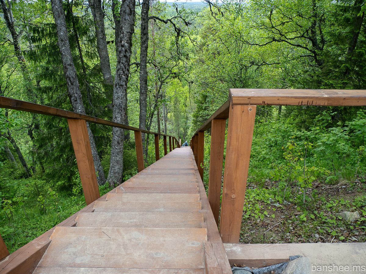 Вниз к дороге можно спуститься по прямой лестнице. Исторически она тут была почти с основания скита, но это — современная реплика, причём недавняя. Предыдущая сгнила к середине десятых. Ходит байка, что поднявшимся по лестнице отпускаются грехи, но это так не работает. Зато как наказание её использовали — провинившиеся должны были два ведра воды принести снизу.