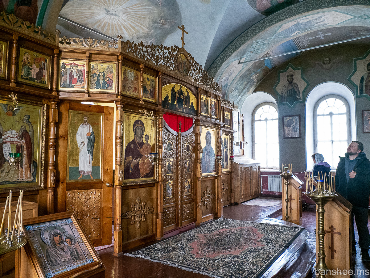 Внутри церкви. В годы лагеря тут располагался штрафной изолятор. Люди должны были молча и неподвижно сидеть на лавках в практически не отапливаемом помещении.
