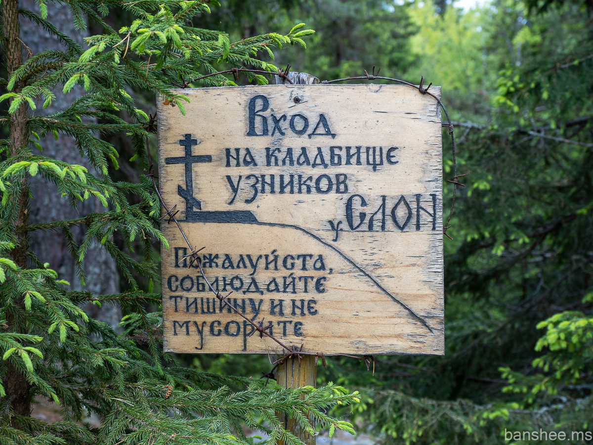 Примерно посреди подъёма находится спуск к кладбищу узников соловецкого лагеря.