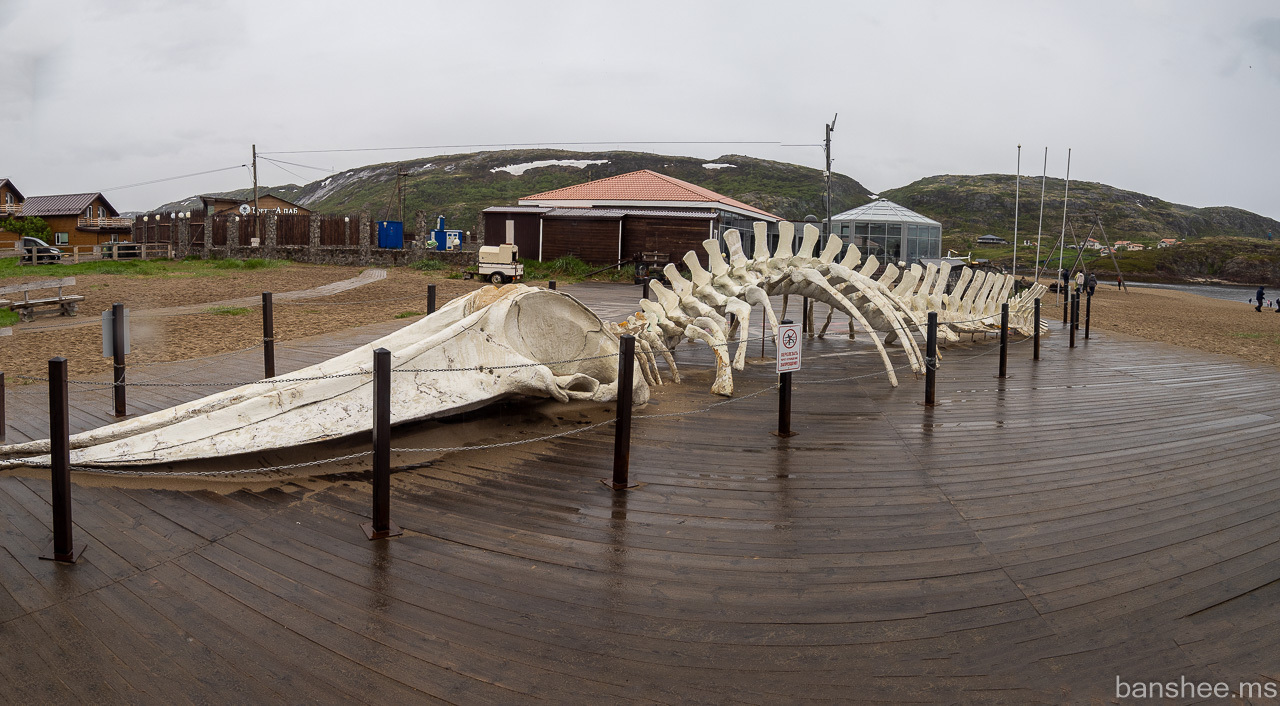 А на берегу в старой Териберке лежит «скелет левиафана». Это реквизит от одноименного фильма, который снимался в этих краях. Скелет искусственный, но крупный, потому для привлечения туристов работает.