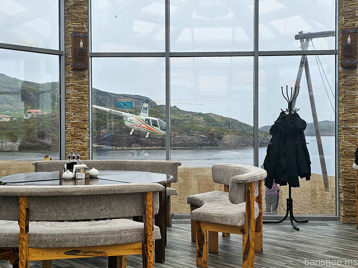 В основном же старая Териберка уставлена всякими туристическими аттракционами. Рестораны, гостиницы и небольшие домики, бани и всякое такое. Есть даже «хаски-парк», где можно было погладить мокрых хаски и покормить облезлых оленей. А пока сидел в ресторане и ждал, когда мне принесут мой салат из восьминогов и лосося, за окном даже вертолёт пролетел. 20 минут прогулки — 60 тысяч.