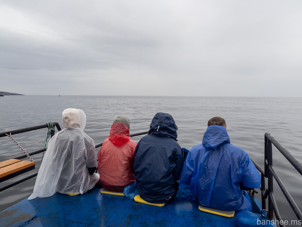 Погода была хорошая. Да, было пасмурно и дождило, но море было абсолютно спокойным. А сама прогулка большей частью выглядел так — сидели и смотрели вперёд и по сторонам, не покажется ли что-то, похожее на кита.