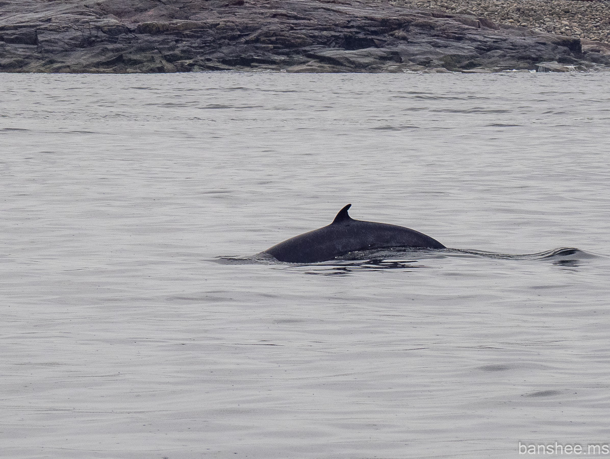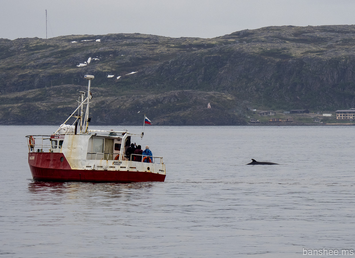 Кита в итоге несколько раз показали, но сильно издали. Было похоже, что по бухте их шлялось две или три штуки. Один явно покрупнее и парочка небольших (или то было один сильно шустрый). Киты были породы малый полосатик, которая особой активностью над водой не отличается. Плавники только выставляет, когда подышать поднимается.