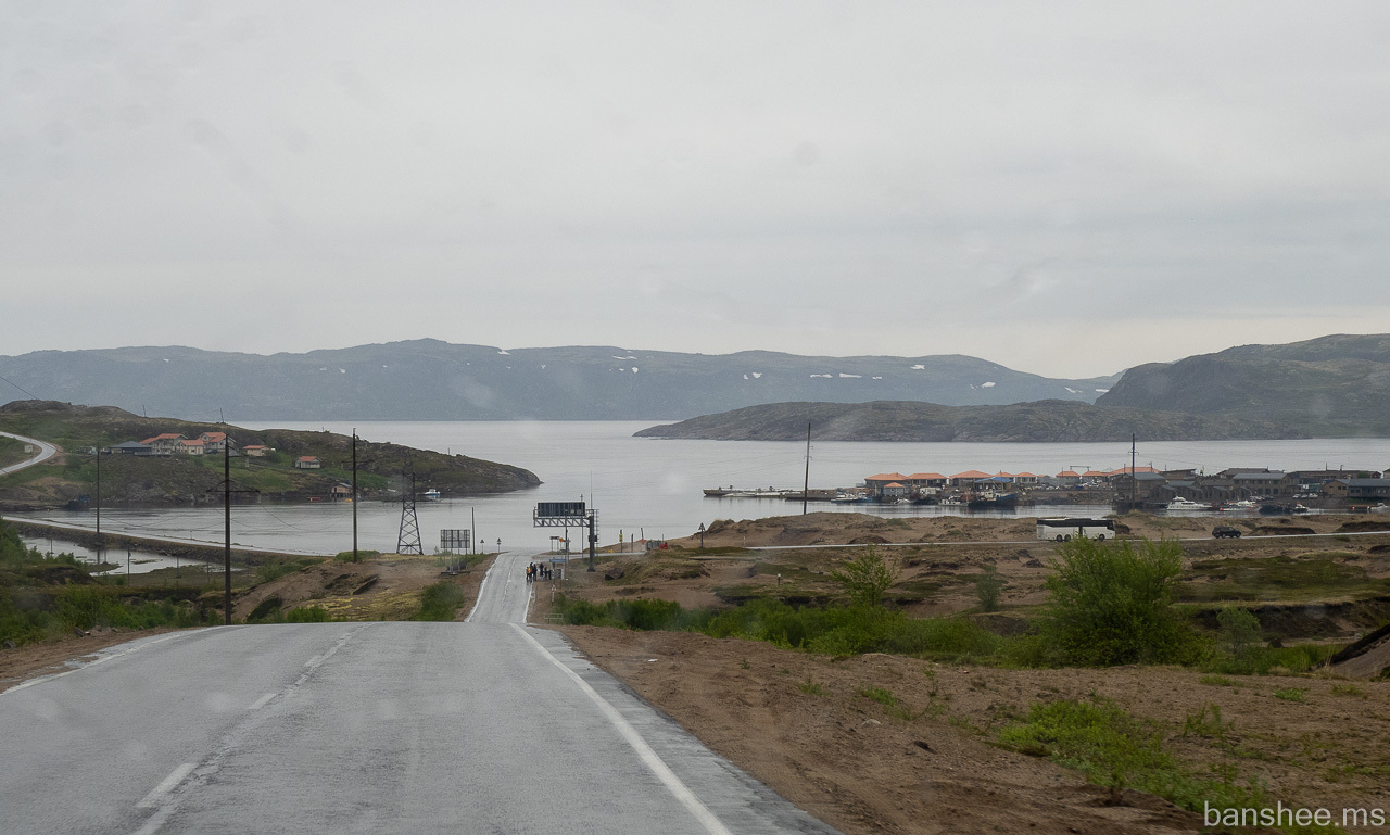 Въезд в Териберку. Направо — старая Териберка, село оттуда начиналось, но со временем ушло в другую точку в паре километров. А тут сейчас большей частью тусуются туристы, местных жителей мало осталось. Но мы туда добрались к ужину, а сперва поехали налево.