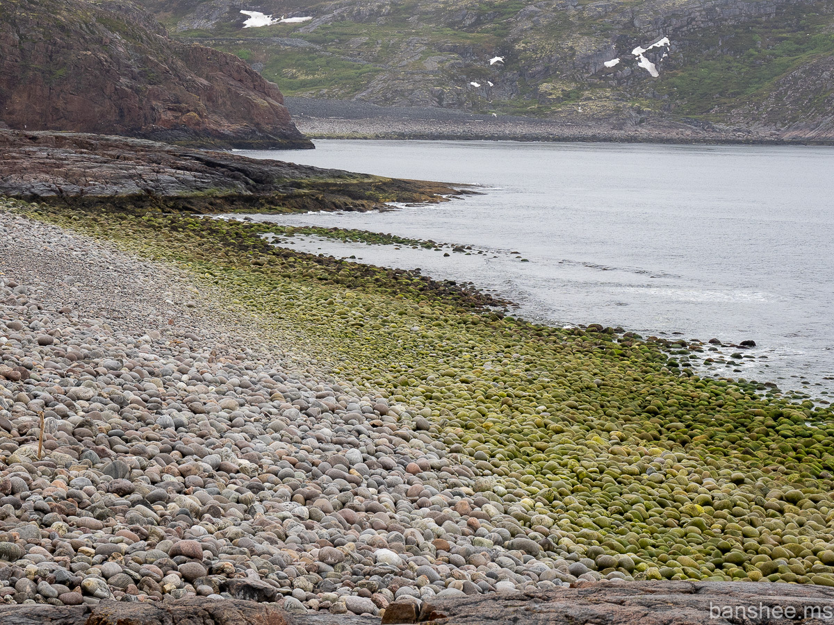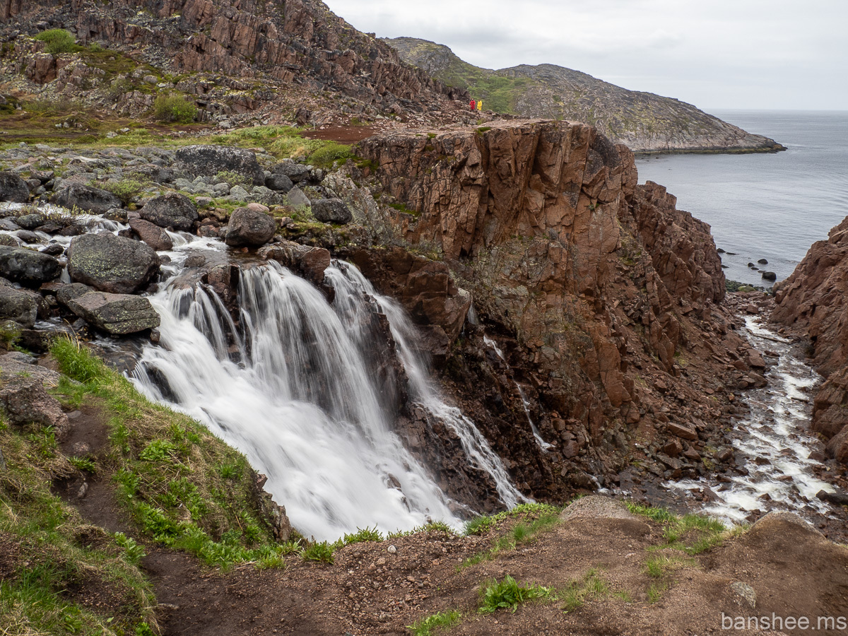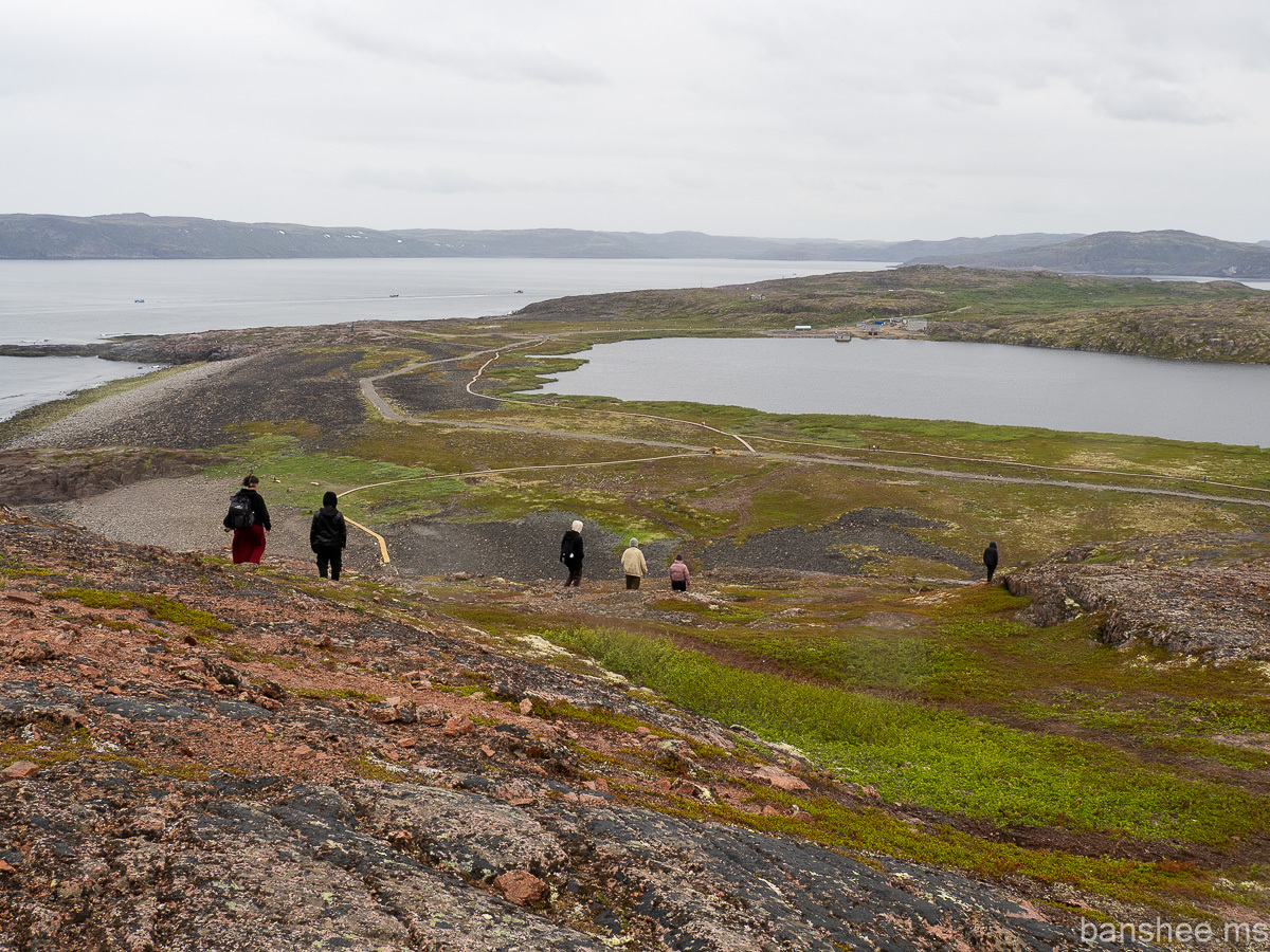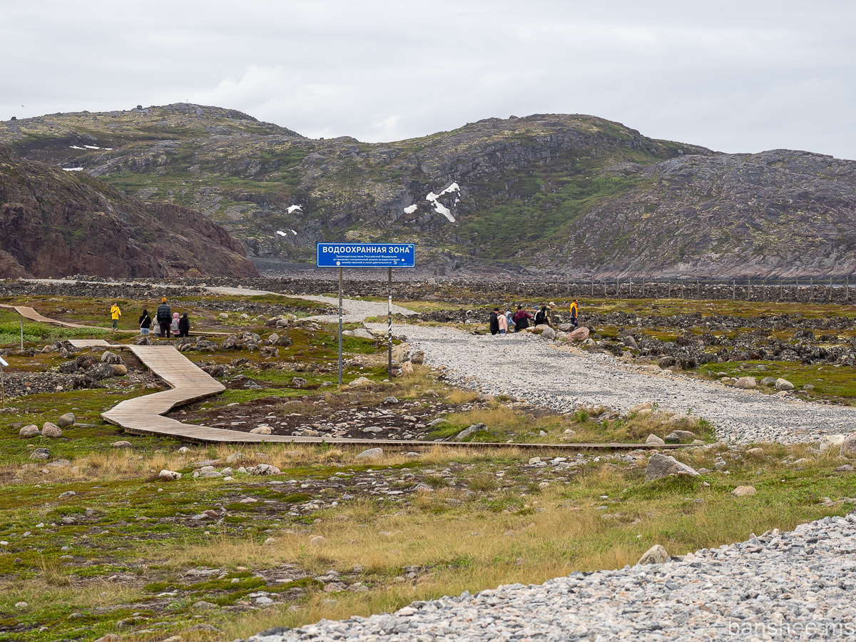 После этого нас повезли в «природный парк Териберка». Там планировали посмотреть на тундру, водопад, пляж «драконьи яйца» и что под руку попадётся. По пути проехали мимо новой Териберки. Официально — посёлок Лодейное. Озеро тоже Лодейное.